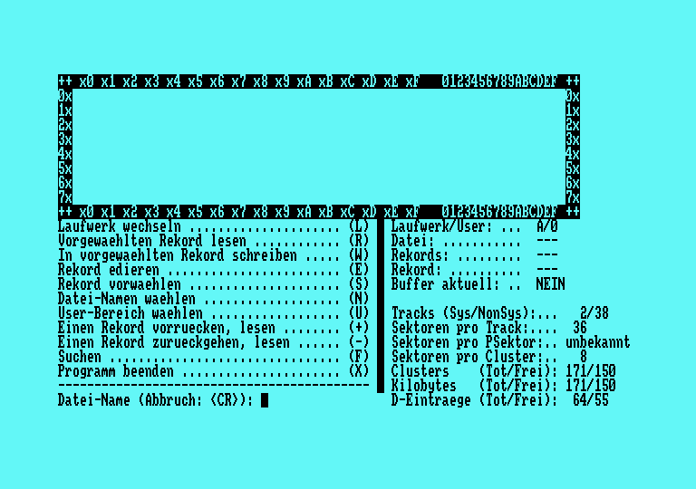 Computerkäufer, die ein CP/M-fähiges System erworben haben, werden bei Problemen außerhalb des "normalen" Nutzungsbereichs doch schnell an die Grenzen ihrer CP/M-Implementation stoßen. Diesen Problemen, beispielsweise dem Retten einer versehentüch gelöschten Datei, will DWERK abhelfen. Natürlich können nur CP/M-Disketten behandelt werden. Die Benutzung des Tools verlangt allerdings Grundkenntnisse in CP/M. Im recht ausführlichen Handbuch wird darauf hingewiesen, daß eine unsachgemäße Handhabung sehr leicht zum Datenverlust führen kann. Ein Nachschlagewerk und/oder (noch besser!) ein CP/M-kundiger Bekannter sind für Neulinge daher sehr wichtig. Erwähnenswert ist die Möglichkeit einer ' Arbeitskopie ohne große Klimmzüge. Bei eventuell auftauchenden Raubkopien kann jedoch der ursprüngliche Käufer des Originals ermittelt werden. Es gibt da eine Menge Tricks, die es den Vertriebsfirmen anzeigen, ob an ihrem Kontrollsystem etwas geändert wurde. Eine Arbeitskopie sollte aber auf jeden Fall erstellt werden, auch wenn die 3"-Disketten des Schneider sehr sta-bü aussehen. Vor dem eigentlichen Programm muß CP/M geladen werden. Das Programm selbst bzw. das Startprogramm von DWERK ist als COM-Datei abgelegt. Das heißt, es kann wie ein anderer CP/M-Be-fehl einfach eingegeben werden. Will man an der Datei arbeiten, gibt es zwei Zugriffsmöglichkeiten: Über die Dateinamen und über die Records. Für den Anfänger ist die erste Version empfehlenswert, da diese nicht ganz so gefährlich ist. Beim Zugriff über den Dateinamen sollte man sich vorher die Directory der zu behandelnden Diskette notiert haben. Einen DIR- Befehl vom Programm aus gibt es nicht. Nach der Auswahl erscheint ein mehrfach geteüter Bildschirm: Im oberen Drittel wird der zuletzt gelesene Record angezeigt. (Ein Record ist ein Datenblock von 128 Byte). Links wird der Inhalt in Hexadezimalzahlen dargestellt, rechts werden die druckbaren ASCII-Zeichen gezeigt. Darunter erscheint links das Menü mit den möglichen Optionen, die einfach auf Tastendruck erreicht werden können. Hier der wesentlichste Ausschnitt, der bei den beiden