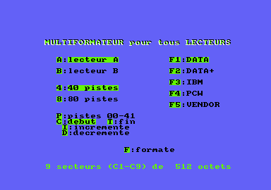 - FN (touche de fonction N, soit la touche numérique N du pavé numérique) : sélection du format correspondant. Cela se traduit par l'affichage en bas d'écran des caractéristiques principales du format choisi. Par exemple pour F1. le format standard DATA, on peut lire « 9 secteurs (C1-C9) de 512 octets ».