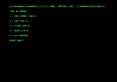 Comme le titre l'indique, il s'agit de formater des disquettes suivant les standards : CPM VENDOR (169 K) , IBM (154 K) , EXTRA (202 K) , DATA (178 K) , UTILISATEUR Tous ces formats peuvent marcher sur l'unité de disquette A ou B. Les formats CPM Vendor, IBM et DATA étant classiques, nous ne donnerons pas d'explications sur eux mais sur EXTRA et UTILISATEUR qui sont particuliers. Le format EXTRA est un format spécial qui formate votre disquette en 202 K avec 4 programmes dessus pour reconfigurer le catalogue. Selon l'unité de travail, il faut "RUNer" DIRA ou DIRB pour avoir le catalogue sous 202 K. Et faire démarrer NORMALA ou NORMALB pour revenir sous 178 K. Le format UTILISATEUR permet à l'utilisateur de formater les pistes qu'il veut et ceci de 0 à 80 pistes. J'ai choisi 80 pistes pour les lecteurs 5 pouces ¼ externes B qui vont, pour certains, jusqu'à ce chiffre. Pour utiliser le mode 202 K, un utilitaire (GESTION) de gestion du mode 202-178 a été créé. L'option catalogue : elle permet d'effectuer un catalogue ou de faire démarrer un programme dans le mode choisi. L'option effacer fichier : elle permet d'effacer un fichier dans le mode choisi ou de changer le USER de travail de 0 à 255. L'option copieur : elle permet de copier un fichier vers un mode semblable ou différent du mode choisi. (Nota : à chaque copie de fichier, le programme va se détruire pour gagner de la place en mémoire et prendre ainsi les fichiers allant jusqu'à 42 K). Au BIP retentissant, Il faut changer de disquette et appuyer sur une touche pour la sauvegarde, lors de la copie. Stéphane ST MARTIN, Amstar n°35 p76