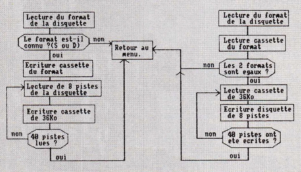 Les disquettes 3” destinées aux micro-ordinateurs Amstrad sont fiables et pratiques, grâce à leur structure rigide et à la protection du disque. Mais elles présentent l'inconvénient, lorsqu'elles ne sont pas rares, d'être assez chères en raison du manque de concurrence. Deux solutions se présentent à l'utilisateur qui a besoin d'une importante mémoire de masse: acheter sans hésitation de nombreuses disquettes du programme pour réaliser des copies intégrales de disquette sur cassette, à une vitesse acceptable.Regardez votre collection de disquettes et comptez celles dont vous ne vous servez presque jamais. Il y a les jeux dont on s'est lassé mais que l'on souhaite néanmoins garder, les nombreuses copies qui permettent de conserver un double au cas où il arriverait malheur à l'original (l'exemple commun à tous est la copie de la disquette CPM et de Dr Logo... Le programme que nous vous proposons offre la possibilité de transférer une face de disquette sur cassette en 12 min 30 s (à 2 000 bauds). On peut ainsi loger 3 disquettes entières sur une C90. De cette façon, vous pourrez libérer de nombreuses faces de disquette pour d'autres emplois. Bien entendu, il faudra patienter 25 minutes avant de réutiliser ces programmes, le temps de les retransférer sur une disquette. Il faut également signaler que ce programme ne fonctionne que pour les disquettes au format « SYSTEME » ou « DATA ». Les disquettes jeux ou utilitaires du commerce ne pourront pas la plupart du temps être sauve- gardées sur cassette car leur format est souvent non conforme aux deux cités précédemment. Dans ce cas, le programme vous indiquera une erreur de lecture. Principe du transfert Comme vous le savez certainement, une disquette est formatée, SYSTEME et DATA, en 40 pistes comprenant chacune 9 secteurs de 512 octets. La ROM de l'AMSDOS comporte des routines qui autorisent la lecture ou l'écriture d'un secteur donné. Le rôle du programme sera de lire les 360 secteurs que comporte la disquette (180 Ko) et d'écrire les données ainsi lues sur la cassette, et vice versa. Mais la RAM de l'Amstrad étant limitée, le transfert est décomposé en 5 étapes semblables, où 8 pistes sont lues et les données écrites sur la cassette en un seul bloc de 36 Ko. On procède exactement de la même façon pour l'opération inverse (lecture de la cassette et écriture sur la disquette). Particularités du programme Le listing complet du programme en assembleur Z80 , présenté en fin d'article, permettra aux initiés de comprendre aisément le fonctionnement de celui-ci. Cependant, quelques points doivent être précisés : le programme utilise les instructions étendues (appelées en Basic par |, comme |DIR, |TAPE...) &04 et &05 situées dans la ROM contrôleur, correspondant respectivement à « Lire secteur » et « Ecrire secteur » (impossible de les appeler en Basic car &04 et &05 ne peuvent être obtenues à partir du clavier, et, de plus, les paramètres doivent être transmis dans des registres du Z80). Le programme doit aussi réaliser l'appel direct d'une routine du contrôleur pour déterminer le format d'une disquette. Lorsque l'Amstrad est mis sous tension, une lecture dans les adresses allant de C000H à FFFFH nous renvoie l'octet adressé en RAM (mémoire écran). Dans ce cas, ceci n'a aucun intérêt et il est préférable de sélectionner une lecture en ROM pour appeler simplement les routines du contrôleur. Cette opération est réalisée par la routine KL ROM SELECT (paramètre C = numéro de la ROM à autoriser). En passant 7 (numéro de la ROM contrôleur) comme paramètre, toute lecture ultérieure effectuée dans les 16 Ko supérieurs de la mémoire se fera dans la ROM 7. Pour trouver l'adresse des instructions étendues &04 et &05, on peut utiliser la routine KL FIND COMMAND, qui retourne l'adresse sur 3 octets de l'instruction dont le nom est pointé par le double registre HL. La dernière lettre du nom de l'instruction doit avoir son code ASCII augmenté de 128 (mise à 1 du bit 7, afin de marquer la fin du nom). Par exemple, pour avoir l'adresse de IDIR, on écrira : LD HL, NAME CALL KL FIND COMMAND RET NAME: DEFM "DI","R"+80HHL contiendra en retour l'adresse effective de la routine et C le numéro de ROM (qui vaut toujours 7 pour les routines du contrôleur).De même, pour &04 et &05, on mettra en NAME: 84H ou 85H. Un JP (HL) au retour de KL FIND COMMAND exécute directement la routine (puisque la ROM 7 est sélectionnée dès le début). Une autre difficulté pourrait provenir des « jump-blocks » du lecteur de cassettes. En effet, comme nous sommes en version disquette, la plupart des jump-blocks cassette sont effacés. Mais ceux qui sont employés (cas write, read, set speed) n'ont aucun équivalent en version disquette, ils sont donc toujours présents en RAM et peuvent être appelés sans précaution particulière. Aucune instruction étendue et aucun jumpblock ne peuvent déterminer le format d'une disquette placée dans le lecteur. Il faut alors faire appel à la fonction BIOS SELDSK, avec demande de sélection automatique du format (routine GETFOR). Mais nous sommes sous AMSDOS et les vecteurs du Bios ne sont écrits en mémoire que lorsqu'on lance CPM ; il est nécessaire de faire appel directement en ROM à la routine correspondante en C4F0H, Les instructions étendues &04 et &05 n'éteignant pas systématiquement le moteur du lecteur de disquettes, des routines de mise en route (TOURNE) et d'arrêt (STOP) du moteur sont présentes. Une temporisation est nécessaire pour le démarrage du moteur, afin que celui-ci ait atteint sa pleine vitesse avant l'appel du Bios, sinon celui-ci nous envoie le message d'erreur « Disk missing ». Finalement, le retour au Basic doit être précédé par une sélection de la ROM Basic, sinon le « plantage » est assuré puisque l'interpréteur ne peut être lancé. Cela est fait par KL ROM DESELECT, qui remet la sélectio