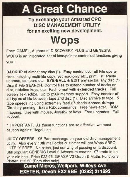 Richard Monteiro gets his ladder and chamois out and peers into a window operating system Back in issue 24 we reviewed a product from Advanced Memory Systems, Max, which is based on WIMP systems. Camel Micros, who have been quiet on the CPC front for the past 18 months, have released a similar package. The acronym WIMP stands for windows, icons, mouse and pointer The mouse is an input device and is used in preference to the keyboard or joystick (Wops doesn't work with a mouse at present, however, this option is promised for later). A pointer is an object on the computer screen whose movements correspond to those of the mouse. It is used to point at objects and select options. Icons are the objects or small pictures from which menus spring. Windows hold menus or options. Wops (windows operating system) replaces Amsdos. It is basically a disk management utility in the same vein as Discology and Oddjob. Wops presents itself as a large window and a cluster of icons. Sadly neither the window nor the icons can be moved to different locations on the screen. Even worse is the fact that the window cannot be increased or decreased in size. By using the arrow keys or a joystick you can move a flickery. intelligent pointer across the Wops screen. Once the pointer is resting on an icon of your choice, a stab at the fire button or return key will select that particular option. The disk drive is constantly checked to see what is present. For instance, if you remove a disk and insert another. Wops will immediately show the directory of the new disk Wops shows flies as icons with the name of the file underneath. These files may be run simply by clicking on the file-icon. From the panel of eight icons you can elect to alter screen colours, print the contents of files, copy files, copy disks, format disks, edit sectors, rename files, erase files and unerase files. The list doesn't end there. Files may be saved to either disk or cassette, external or bar commands may be accessed, drive number is selectable and extra memory may be used (assuming you have it). The idea of a WIMP environment is to make it simple for the user to choose options and get from one menu to another with the minimum of fuss. Wops fails to do this. Achieving certain tasks can be very confusing - the manual is less than helpful. Wops has good features: the functions work correctly and there are some novel touches (like the constant scanning of the drive and being able to run a file simply by clicking on an icon), However, if Wops is your first encounter of a WIMP-like system, you'll be disappointed. Richard Monteiro, AA |