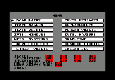 EVENEMENTS MINEURS : nous arrivons là à ce qui constitue une des phases ardues de la création de votre jeu mais qui est grandement facilité par la souplesse de JADE. En gros, c'est ici que vous allez devoir expliquer à votre ordinateur comment cela se passe pour ouvrir la porte de la salle 4 avec la clé 7. On explique donc qu'il faut être en présence du verbe OUVRE ou d'un de ses synonymes (rares, je le concède) et du mot PORTE. Puis, on stipule que la CLE doit être présente dans l'inventaire. A vous ensuite de décider si, une fois la porte ouverte, la clé doit être encore en possession de l'aventurier ou non. Ce n'est qu'un exemple bête, et vous pourrez bien sûr entreprendre des choses plus compliquées. Les événements mineurs sont ceux qui dépendent d'une phrase entrée par le joueur avec le clavier du CPC. des actions du joueur. Par exemple, après une phrase du genre OUVRE PORTE AVEC CLE, le message de l'ordinateur est BRAVO !! C'EST LA BONNE CLE !!! PLACER OBJET : dans ce sous-menu, vous allez placer les objets dans les endroits où vous avez décidé qu'ils doivent se trouver (c'est vous le créateur !), et par exemple placer l'objet 4, qui est une gourde, dans la salle 9, qui est un débarras. MESSAGES SYSTEME : ces messages sont ceux affichés par l'analyseur syntaxique et dépendent des actions courantes telles que VOUS AVEZ : après la commande INVENTAIRE par exemple. Là aussi, à tous ces messages est attribué un numéro. EVENEMENTS MAJEURS : ils fonctionnent de la même manière que les événements mineurs, mais se déroulent sans qu'aucune phrase du joueur soit interprétée. C'est avec ce principe que l'on peut simuler la fatigue ou la faim de l'aventurier, comme il est expliqué dans le manuel de JADE. Les événements majeurs sont exécutés après chaque entrée au clavier, mais avant l'analyse des événements mineurs. Vous pouvez ainsi décider de comptabiliser le nombre d'entrées au clavier dans un compteur. Si, à la trentième entrée, le joueur n'a toujours pas mangé, alors le message VOUS AVEZ TRES FAIM apparaîtra. Si le joueur mange quelque chose, le compteur est remis à zéro ; dans le cas contraire, lorsque le compteur arrive à 0, le joueur meurt de faim, par exemple. CHARGER/SAUVER FICHIER : vous pouvez bien entendu sauver sur disquette l'état de votre jeu pour le reprendre le lendemain. TESTER JEU : va vous permettre de tester le bon fonctionnement de votre jeu et le bon enchaînement des actions que vous avez décidées. Vous pourrez aussi créer des jeux chaînables sur plusieurs disquettes, pourvu que ceux-ci utilisent le même vocabulaire, les mêmes objets et les mêmes textes. JADE OU PAS JADE ? Attention, je vous aurai prévenu, vous ne pourrez pas créer des super jeux avec animation dans tous les sens et bande son pendant tout le jeu, ni encore des sprites à chaque coin de salle ; pas de sélection par icônes non plus. Non. JADE permet de créer des jeux d'aventures hyper classiques avec une fenêtre graphique et un analyseur syntaxique que vous étofferez à votre bon plaisir ; c'est du très classique, comme on en voyait il y a quelques années maintenant, mais JADE sait très bien le faire !!! Si vous avez des idées plein la tète et aucun talent de programmation, JADE est pour vous !!! Lensemble du produit brille par la qualité de réalisation, bref, c'est un bon investissement pour tout aventurier en herbe !! Indiana Robby, A100% |