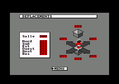 Première restriction, et elle est fort compréhensible, JADE n'existe qu'en version disquette et ne permet de générer que des jeux sur disquette, la gestion d'un jeu d'aventures digne de ce nom étant impensable sur un système cassette. Nous nous trouvons donc avec une disquette contenant l'utilitaire lui-même et une démonstration de ses possibilités, ainsi qu'une documentation d'une cinquantaine de pages. PAR OU COMMENCER ? Attention, la réalisation d'un jeu d'aventures est quelque chose qui ne s'obtient pas d'un simple claquement de doigts, ni aussi facilement qu'un RUN "MBC" sur le clavier de son CPC. JADE n'est pas un générateur de scénarios ; le programme n'intervient qu'après cette première étape où l'on essaie de mettre sur papier le scénario imaginaire que l'on a envie de faire vivre grâce à l'ordinateur. La notice de JADE est d'ailleurs claire à ce sujet et, si vous ne vous êtes jamais confronté au jeu d'aventures, elle vous initiera de façon simple à la création d'un scénario avec un exemple concret. Grâce à la notice, vous saurez décomposer votre scénario en pièces, objets, personnages, lieux, actions, directions, etc., pour le faire entrer dans la mémoire de votre ordinateur. Donc, il vous suffit simplement d'avoir un esprit joueuret de bonnes idées de scénario : JADE et son excellente notice font tout le reste ou presque. A l'apparition du menu général de JADE, on est agréablement surpris par sa clarté. Tout au long de l'utilisation, et même si certaines opérations paraissent fastidieuses, vous retrouverez la même simplicité et les mêmes commandes, dans chaque menu, où l'on utilise les touches fléchées du curseur pour sélectionner et la barre d'espace pour valider. AUSSI SIMPLE QUE JADE... VOCABULAIRE : c'est l'endroit où vous allez entrer tout le vocabulaire de votre jeu. JADE y a déjà inscrit quatorze mots, qui sont les directions et les principaux verbes inhérents à tout jeu a aventures, tels que prendre, poser, sauver, charger, etc. Vous pouvez définir les synonymes de chaque mot, car si vous désirez que votre aventurier fouille un coffre, lui voudra peut-être l'examiner. Ainsi, le mot numéro 16 du vocabulaire sera FOUILLER et aussi EXAMINER. Dans ce sous-menu vous pouvez donc faire défiler tout le vocabulaire, ajouter et supprimer des mots. TEXTE SALLES : dans le scénario que vous avez écrit sur papier, vous avez dessiné une petite case pour chaque lieu du jeu avec, à l'intérieur, sa description, les objets que Ton y trouve et les actions que l'aventurier doit y faire. Ici, vous allez saisir le texte qui décrit chaque salle du jeu et attribuer à chacune un numéro. TEXTE OBJETS : ici vous vous contentez de donner un numéro et un nom à chacun des objets ou personnages que l'on peut trouver dans votre jeu. ATTRIBUTS OBJETS : ce sous-menu est en rapport direct avec le précédent, puisqu'il s agit ici de préciser si un objet doit être pris avec la main, dans un sac, etc. Pour cela vous allez associer un TEXTE OBJET avec un mot issu directement du VOCABULAIRE et lui attribuer ses spécifications : SAisissable (oui/non) en MAin (oui/non). TEXTE MESSAGES : est l'endroit où l'on saisit tous les messages dépendant GRAPHISME : ah, là je vois votre œil intéressé !! Comme JADE permet de créer des aventures graphiques, il fallait proposer des options graphiques originales et performantes. L'auteur de JADE a trouvé le bon compromis en permettant de récupérer des dessins depuis n'importe quel utilitaire graphique, du moment que la page générée est sauvegardée sous le format standard d'un fichier de 16 ko en adresse &C000. Deux restrictions : les images ne peuvent être qu'en mode moyenne résolution et quatre couleurs, et elles ne seront pas pjein écran. Les images du jeu seront affichées dans un cadre représentant environ le quart de l'écran de votre CPC. Chacune de vos images sera chargée dans le menu GRAPHIQUE ; là. vous saisirez dans un cadre la portion d'image qui apparaîtra dans le jeu, puis vous pourrez sélectionner couleurs d'encre et de bord. Ensuite, l'image sera compactée puis sauvée. JADE offre de plus un formatage spécial image et vous pourrez dessiner vous-même l'écran principal de jeu, celui dans lequel apparaîtront textes et graphismes ; il ne faudra donc pas oublier de laisser de laplace pour ceux-ci. Le procédé d'illustration permet d'offrir des images de bonne qualité puisque issues d'un digitaliseur, pourquoi pas, et en grand nombre, car compactées. Bien vu. DEPLACEMENTS : dans ce menu, vous déciderez de l'interconnexion entre les salles, avec les directions classiques qui sont nord, sud, ouest, est, bas et haut. Cette interconnexion se fait entre les différents numéros de salles, comme vous devrez le prévoir sur votre plan de jeu.