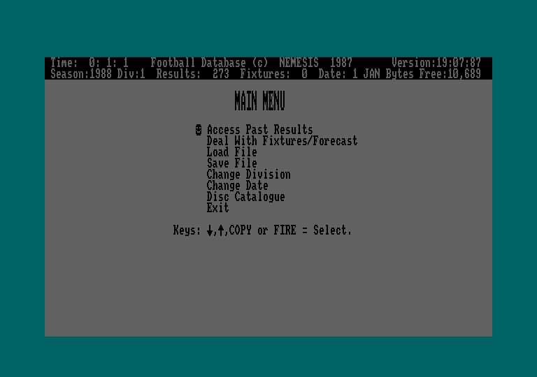 The program can also totalise fields, which means it could be used by a small business, to keep stock or transaction records for example. Also provided is a Utilities menu, which includes, among other things, facilities to catalogue discs and rename, but not erase, files. Data Manager is a very simple database program, it follows that it is easy to use. The supplied record collection file is one sort of database the program can easily handle, but it should also be ideal for storing things like the membership details of a small club to the client list of a travelling salesman. Barbados here I come THE best known method for winning the jackpot on the treble chance is called the lucky numbers method. The very fact that people who do the same numbers every week seem to be the ones who hit the jackpot time after time is proof enough that studying the form of football teams is not only a waste of time, but is actually counter-productive. What then are we to make of a program that studies football form and predicts homes, aways and draws? Like all football pools forecasters, Pools Predictor claims that its predictions consistently outperform chance. Now the fact is that if you pick a number of matches at random to be homes, about 49 per cent will result in wins for the home team. Similarly, if you pick a number of matches at random to be Aways, around 26 per cent will be correct predictions. For draws - score and no-score collectively - the figure is 25 per cent. These are the scientific "chance" figures, so outperforming chance, it would seem, does not actually get us anywhere near the 80 per cent reliability needed for a jackpot on the Treble Chance every week. Despite these facts, football pools forecasters still sell. Pools Predictor is easy to use. The season is set up by an initialisation program, where you enter the names of each team in each league. Up to nine leagues can be entered, specifying whether each plays the Scottish system, where each team in the division plays another team in the division more than once at home, or the English system, where each team plays another only once at home.