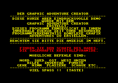 Adventures erfreuen sich einer allseits wachsenden Beliebtheit. Sei dies nun bei jenen Leuten, die sich gerne vor ein gut gemachtes gekauftes Computerabenteuer setzen, oder bei denen, die sich von der programmiertechnischen Seite her nähern, und sich ihre Adventures selber schreiben. Nun gibt es ein Programmiertool, das sich an die Vertreter beider Seiten wendet. Der Graphic-Adventure-Creator Sicherlich haben viele unserer Leser schon einmal eine schlaflose Nacht vor ihrem Computer verbracht, nur weil sie an dem vermaledeiten Höhlenschrat nicht vorbeikommen. Sei das Problem, das sich ihnen in den Weg stellt, nun ein Höhlenschrat, ein Drache oder eine verschlossene Tür, eines ist ihnen allen gemeinsam, sie sind der Bestandteil eines Adventures. Nicht minder viele Leute haben aus einem anderen Grund ihren Rechner nächtelang nicht ausgeschaltet: Sie brüten vor einem Programm, das sie gerade erstellen. Fest steht außerdem noch, daß sich ein guter Teil der Programmierer, die sich die Nächte um die Ohren hauen, an Adventures herumhacken. In dem hier anstehenden Test wollen wir Ihnen ein Programmiertool vorstellen, das gewiß viele Adventurespieler und noch mehr Adventureschreiber interessieren wird. Nämlich ein Programm, mit dem sich auf einfachste und sehr zeitsparende Art und Weise die spannendsten Adventures erzeugen lassen. Lassen Sie sich aber nun von dem Wort "erzeugen" nicht erschrecken, denn natürlich erzeugt der Graphic-Adventure-Creator nur das endgültige Programm aus den von Ihnen vorgegebenen Fakten. Also ist das erste wirklich interessante Feature, über das der GAC verfügt, die Tatsache, daß alle mit ihm erstellten Spiele komplett alleine laufen; also einen Code erzeugen, der "Stand allone" auf Ihrem Rechnerläuft. Lassen Sie doch erst einmal folgende Fakten auf sich wirken: bis zu 9999 verschiedene Räume, 255 Objekte, 255 Meldungen, 255 Verben, 255 Substantive, 255 Adverben. Also wenn sich aus diesen Zutaten kein gutes Abenteuer brauen läßt, dann mit gar nichts. Doch damit sind noch nicht alle Features über, die der GAC verfügt, aufgezählt. Auch für die, die der Meinung sind, daß Graphikadventu-res das Allergrößte seien, ist der GAC das optimale Werkzeug. Wie der Name schon verrät, ist in dem Programm ein Graphiktool mit eingearbeitet. Und auch die mit diesem Tool erstellten Bilder lassen sich in das Programm miteinbinden. Allerdings müssen wir hier auch darauf hinweisen, daß ohne eine zündende Idee selbst so ein ausgefeiltes Werkzeug wie der GAC nutzlos ist. Denn am Anfang eines guten Abenteuers steht immer eine gute Story. Sie sollten sich also zuerst einmal überlegen, um was es eigentlich in Ihrem Abenteuer gehen soll. Man braucht dabei eigentlich gar nicht so stur sein und sich diese Geschichte selbst ausdenken - manchem fällt eine solche Aufgabe sowieso nicht sehr leicht, überlegen Sie doch einmal ein bißchen. Sicherlich ist Ihnen in letzter Zeit ein Buch besonders in Erinnerung geblieben; vielleicht läßt sich ja dessen Story mit leichten Änderungen adaptieren. Mit ein wenig Phantasie kann man sogar aus einem Märchen von den Gebrüdern Grimm ein fetziges Abenteuer machen. Haben Sie nun eine geeignete Geschichte? O.K., lassen Sie uns sehen, wie es weitergeht.