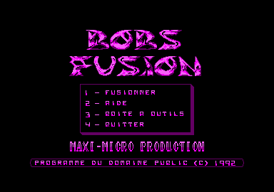 MAXI - MICRO PRODUCTION vous presente Bobs Fusion qui sera bientot pour vous le complement indispensable de Bobs Creator. Il va vous permettre d'assembler vos bobs ( ou sprites ) que vous aurez sauvegarde avec Bobs Creator. Ce rogramme, tres souple d'emploi, vous offre plusieurs options.