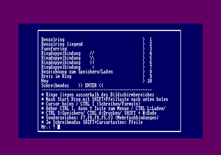 Chemocad ist ein Programm, mit dem man chemische Formeln zusammensetzen und Reaktionsgleichungen aufstellen kann. Nach dem Programmstart (run “chemocad) erscheint das Menü. Über die Auswahlziffern 1 -3 kann man einen Benzol- oder Fünferring in den Bildschirm durch Drücken der SHIFT- und unteren Pfeiltaste hineinführen (beide Tasten niedergedrückt halten). Die Positionierung des Ringes erfolgt auf gleiche Weise mit den anderen Pfeiltasten. Gleichzeitiges Drücken der CTRL- und 1-Taste führt zum Schreibmodus (Cursor erscheint oben links). Jetzt kann man den Cursor mit den Pfeiltasten (ohne SHIFT) steuern und Sonderzeichen, wie schräg stehende Doppelbindungen oder Dreifachbindungen, auf dem Funktionstastenblock abrufen. Auch die Schrägstriche, das Gleichheitszeichen, der Bindestrich und der senkrecht stehende Balken (über dem Klammeraffen), werden zur Formelerstellung genutzt. Das Löschen erfolgt durch Zurücksetzen der Cursors und Drücken der DEL- oder Leertaste. Aus dem Schreibmodus kommt man über die Pfeiltaste unter dem Pfundzeichen wieder ins Menü zurück. Das Menü erscheint, ohne daß die bisher erstellte Formel zerstört wird. Nur durch die Wahl der Ziffer 9 wird das bisherige Bild gelöscht. Es besteht die Möglichkeit, in den Ring Doppelbindungen (Ziff. 4-6) einzuzeichnen. Nach Aufruf der entspre chenden Ziffer erscheint im zuletzt gezeichneten Ring die gewünschte Doppelbindung. Mit SHIFT (Dauerfunktion) und den Pfeiltasten wird die Bindung in die richtige Position gebracht. Das ganze erfolgt in 1-er-Schritten, während die Ringverschiebungen in 8-er-Schritten abläuft. Mit CTRL und I geht man wieder in den Schreibmodus zurück, kann dort weitere chemische Symbole mit Bindungen und Zahlen schreiben oder über die Pfeiltaste ins Menü zurückkehren. Will man mehrere Ringe aneinanderfügen, so führt man den zweiten Ring in die Nähe des ersten und über eine „Feineinstellung” (1-er-Schritte) setzt man den Ring an. Diese geringe Schrittweite erhält man durch gleichzeitiges Dauerdrücken der SHIFT- und COPY-Tasten und Steuern mit den Pfeiltasten. Will man die Formel speichern, so erscheint nach Aufruf des Menüpunktes 8 ein weiteres window, in das man die Bezeichnung eingibt. Über CTRL s wird die Formel auf Diskette gesaved. Will man eine abgespeicherte Formel laden, so wählt man über Menüpunkt 8 das Bezeichnungswindow an, schreibt die Bezeichnung des abgespeicherten Files hinein und nach Drücken der ENTER-Taste wird über CTRL 1 die Formel geladen. Mit der Pfeiltaste kommt man ins Menü zurück. Der Ausdruck erfolgt über den Schreibmodus (Cursor muß zu sehen sein) mit CTRL d. Hierzu wird die Hardcopyroutine geladen und automatisch aufgerufen. Dieser Vorgang dauert einige Sekunden. Die HC läuft nur auf dem NLQ 401. Bei Verwendung eines anderen Druckers muß eine entsprechende HC-Routine eingefügt werden. Nach etwas Übung ist man in der Lage, Formeln zusammenzustellen und sauber auszudrucken. Will man die Formeln in einen Text einbinden, so muß man entsprechend Platz frei lassen, um dort später die Formeln mit Chemocad einzusetzenv