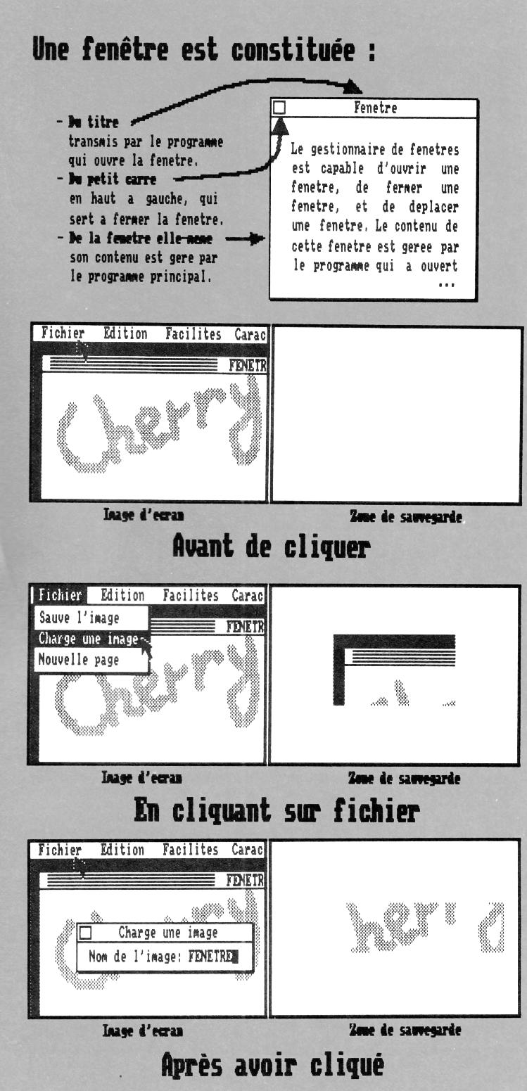 que sa largeur et sa hauteur. Le gestionnaire teste alors la validité de ces données et déplace éventuellement la fenêtre à l'intérieur de l'écran si elle dépasse. A ce moment-là, il va sauvegarder la portion d'image qui se trouve à l'endroit où va être placée la fenêtre, dans une zone mémoire réservée. C'est seulement maintenant que va s'effectuer l'ouverture réelle de la fenêtre : le gestionnaire remet à blanc la portion d'écran, l'entoure d'un cadre, prévoit une place pour le titre de la fenêtre et trace le petit carré en haut à gauche. - Le gestionnaire renvoie alors au programme qui l'a appelé une adresse où il pourra inscrire le titre et une deuxième adresse qui est celle du premier octet de la fenêtre. C'est alors le programme principal qui "décide" de l'ouverture de la fenêtre qui devra gérer le contenu de cette fenêtre.