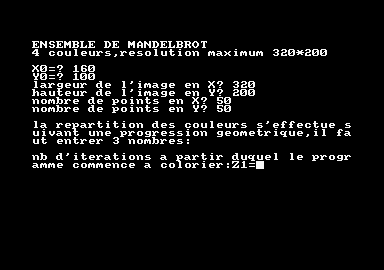 n fait, le chaos n'apparaît pas seulement en physique, où l'on peut toujours se dire qu'il est dû à des impondérables, au hasard, à l'inévitable imperfection des phénomènes naturels. On le trouve aussi dans le domaine à la pureté sans faille des mathématiques, où certaines fonctions très simples et complè-tement déterministes engendrent des structures chaotiques à la complexité sans limite, semblant échapper à la toute-puissance de l'analyse. C'est le cas notamment de la fonction : f(x) = x2 + C, qui met x au carré et lui additionne une constante C. Si l'on itère cette fonction, on forme une suite récurrente comme par exemple celle-ci : — 2 ; — 2² — 1 = 3 ; 3² - 1 = 8 ; 82 — 1 = 63 ; 63² — 1 = 3 968 ; etc. En appelant Un le nième terme de cette suite, on a : Un + 1 = (Un)² + C. Dans cet exemple, Uo = - 2 et C = - 1. On obtient une infinité de suites différentes en faisant varier Uo et C. Certaines sont amusantes : (C = - 2 et Uo = 0) engendre 0 ; - 2 ; 2 ; 2 ; puis toujours 2 ; (C = 0 et Uo = 1) engendre une suite de 1 ; (C = - 3 et Uo = 2) génère 2 ; 1 ; — 2; 1 ; — 2; 1 ; — 2; etc. Comment savoir à l'avance le comportement d'une suite donnée, tel va être le problème. Précisons la question : quel est I ensemble des couples de nombres (C et Uo) qui engendrent des suites ne tendant pas vers l'infini, quel que soit le nombre d'itérations ? Ne pensez pas que nous allons vous le dire, car personne ne le sait actuellement ! Bien sûr, quelques cas particuliers sont connus, tels ceux cités précédemment. Cette question devient encore plus intéressante si on laisse les variables Uo et C s'échapper de l'ensemble des réels et parcourir le plan complexe (voir article sur les complexes, in fine). Si vous vous attaquez au problème analytiquement, vous serez très vite confronté à des équations inextricables. C'est à partir de là qu'il faut raisonner géométriquement. Le raisonnement géométrique Si nous attribuons un point de l'espace à chaque couple de nombres (C, Uo), étant donné que C et Uo peuvent parcourir le plan complexe indépendamment l'un de l'autre, soit deux dimensions chacun, alors le couple de ces deux nombres parcourt un espace à quatre dimensions. Pour voir l'ensemble de ces points, il suffit de faire des coupes à travers cet espace, en fixant un ou deux des quatre paramètres (les parties réelles et imaginaires de chacun des deux nombres complexes). On obtient alors un volume à trois dimensions ou un plan exactement comme on obtient un plan en coupant un bâtiment à une certaine hauteur. Le premier à effectuer cette démarche fut M. Julia, au début du siècle. Il fixait le paramètre C, et observait les courbes obtenues en faisant varier Uo dans le plan complexe. Pour obtenir une image, il faut faire un balayage : diviser une partie du plan en lignes et colonnes, puis faire parcourir à Uo le centre de chaque petit carré, intersection d'une ligne et d'une colonne. Pour obtenir une image de bonne qualité, il faut une quantité énorme de calculs : on conçoit ici l'intérêt de l'ordinateur. C'est avec lui, utilisé un peu comme un moyen de perception, que Benoît Man-delbrot a produit le premier des images de l'ensemble de nombres qui porte son nom : il a fixé le nombre de départ Uo = 0, et a fait varier la constante. Il a donc coupé notre espace quadridimen-sionnel selon un plan totalement indépendant du plan de coupe de Julia (les ensembles de Julia sont dans plusieurs plans de coupes, mais ils sont tous parallèles). La méthode employée est très simple : pour chaque point, on calcule les termes de la suite les uns après les autres. Dès que l'un de ces termes dépasse le module 2, on compte le nombre d'itérations effectuées et on affecte une couleur à ce point en fonction de ce nombre, car il a été prouvé que si un terme de la suite dépasse 2, alors elle tend vers l'infini. Si l'on n'atteint pas 2 au bout d'un grand nombre d'itérations (« grand » peut aller de 100 à 1000, en fonction de l'échelle de représentation), on considère que le nombre appartient à l'ensemble de Mandelbrot (ou de Julia). Ainsi, les limites entre différentes couleurs correspondent à des « courbes de niveau ». Pour les ensembles de Julia, ces courbes vont même jusqu'à correspondre exactement aux lignes équipotentielles qu'on obtiendrait si l'ensemble était chargé électriquement, ce qui est extraordinaire si l'on sait que ces lignes sont presque impossibles à calculer pour les formes géométriques simples. Contrairement aux ensembles de Julia, l'ensemble de Mandelbrot n'est pas autosimilaire. On y observe même une diversité et une prolifération de formes qui nous font penser à ce qu'on verrait si l'on faisait une coupe du globe terrestre : une augmentation progressive de la richesse, de la turbulence, de la vie au fur et à mesure que l'on s'approche de la surface. La surface même de l'ensemble de Mandelbrot est inaccessible et nous sommes condamnés à n'en voir que des courbes de niveau qui l'entourent. Le mode d'emploi Le programme (listing) permet de s'enfoncer dans l'infiniment petit, en agrandissant la parcelle de votre choix dans une image précédemment créée et sauvegardée sur disquette. Il y a peu de choses à dire sur le mode d'emploi, tout étant expliqué au fur et à mesure. Voici tout de même ses fonctionnalités principales :