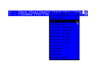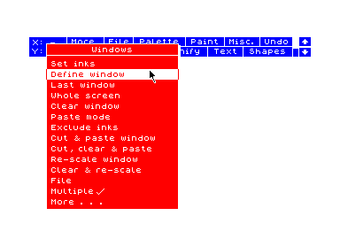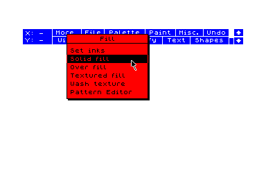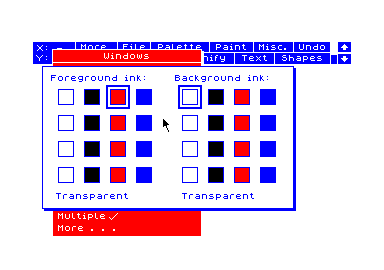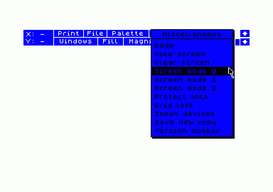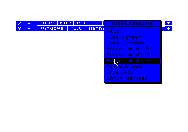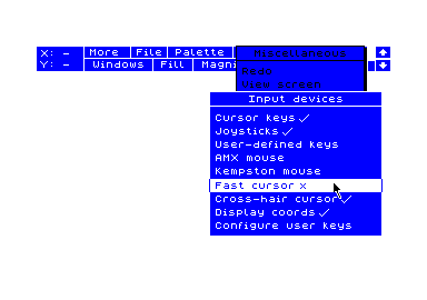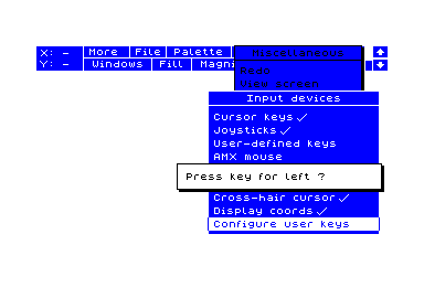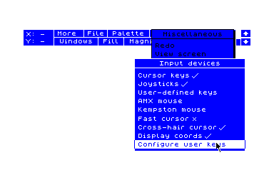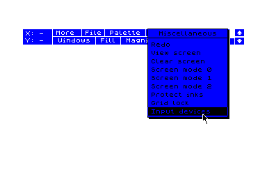 Ce mot étrange ne signifiant rien et tout en même temps, ça vous dit quelque chose peut-être? Vous avez raison de dire oui car ce menu vous permettra de choisir le moyen le plus adéquat d'assouvir vos talents d'artiste (joystick, souris et pourquoi pas clavier). Enfin un éditeur qui a pensé à l'ergonomie de son produit.