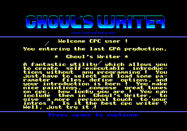 If you regularly swap software with another CPC-owning friend, and you're too lazy to write a letter to them, Ghoul's Writer is for you. It's a superb utility allowing you to write your own letters on disc, including fonts, music, letterheads, and even animations! At first, you don't know where to start, as there are so many files on the disc! Fortunately, there's a help file for both French and English users, although at times the English help file is difficult to understand. There's also some tunes, animations, and a screen of clip art if you're stuck in designing a letterhead. The main bit is the text editor. This is where you type out your letter. Although nowhere near as advanced as the likes of Protext, it's still user-friendly and letters can be written out with few problems. When you've finished, save the text. You will also need to convert the text so that you can use it when you'll link all the bits together. As well as the text, you'll also need to design a logo. You'll need an art package for this, and first you must run a program on the disc which saves a screen with a frame in it. You might also want to use your own font, but you'll need Advanced Art Studio for this. If you don't own AAS, there are already some fonts included on the Ghoul's Writer disc. As for music, you'll need a Soundtrakker .SNG file, then you will have to run a program which converts it to a .MUS file which can then be used in your letter. If you don't have any Soundtrakker files, you can use the ones that come with the Ghoul's Writer disc. As you might imagine, all this is very time-consuming, so it's useful to keep some files on a separate work disc for you to use each time. With the linker program, all the files are linked together. You can alter the colours of the logo, the text, and the raster bars, and once you're satisfied with everything, you can then save it out to disc, and all you need to run it after that is entering RUN"LETTER" (or whatever). OTTO