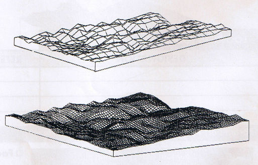 Au détour d'une page de revue spécialisée ou de publication scientifique, nous avons tous découvert avec curiosité et souvent envie les entrelacs esthétiques et organisés des modèles numériques de terrain.Encore aujourd'hui, Il est plus habituel de les rencontrer dans le silence feutré des laboratoires que dans une parution dévouée à un ordinateur grand public. Au-delà d'un louable souci de démocratisation, la réalisation d'un programme de modèle numérique de terrain (ou MNT) de qualité professionnelle sur CPC implique la résolution de deux problèmes pratiques : tenir compte d'une capacité mémoire limitée (ces logiciels en sont fort gourmands) et d'un temps de travail raisonnable (graphismes et calculs matriciels n'étant peut-être pas les qualités majeures de notre ordinateur). Le principe retenu doit beaucoup au bon docteur Guillotin : j'ai séparé la tête du corps ! La première calcule, le second dessine. La tête génère une carte numérique de terrain en quelques dizaines de secondes grâce à une petite matrice mobile ou KERNEL qui pratique le miracle de la multiplication des pains. Pour un canevas de 324 données, le programme KERNEL nous en offre 4761, valeur largement suffisante pour bâtir un modèle de qualité (doc. 1,2 et 3).