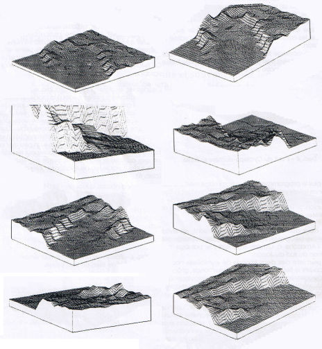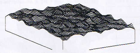 La deuxième matérialise le champ de pression atmosphérique au Sud de l'archipel nippon. Elle montre le passage d'un typhon, dépression d'origine tropicale aux effets souvent dévastateurs. L'utilisateur curieux des nouvelles techniques géographiques souhaitera rapidement mettre «la main à la pâte». Dès l'instant où la lecture de la carte topographique lui est familière, tous les espoirs lui sont permis. Pour faciliter le travail, toujours fastidieux, de saisie des données, KERNEL intègre une option correction pour modifier à tout moment une valeur du fichier numérique. Les moins méthodiques ne verront que peine et sueur dans ce travail méticuleux (labor improbus omnla vincit). Qu'ils lancent sur l'ordinateur le sous-programme centésigraphe. Ce dernier explore l'univers graphique des fonctions mathématiques sans rien céder à la mode des fractales. Véritable générateur «d'altitudes», Il fonctionne de manière aléatoire fractionnant les nombres réels fruits de relations plus ou moins complexes (selon votre désir). Il crée ainsi un monde numérique Imprévisible. Dans la pratique les paysages obtenus appartiennentà un «ordre chaotique». En un mot, on saupoudre un peu de hasard tout en semant dans la mathématique pour récolter des images artificielles étonnantes certes par leur diversité mais surtout par le Jeu de relations qui les caractérisent (doc. 6).