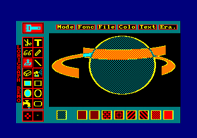 Le sacre des icônesConvivialité et simplicité sont les deux piliers du logiciel de création graphique contemporain. Les remakes de Mac Draw se ramassent à la pelle. Spectrum en fait les frais, Amstrad s'en tire bien. La couleur met du piment. Décidément l'esprit qui enfanta Mac-Draw est génial. Qui dit succès commercial voire inspiration, dit aussi imitation . Après Digital Research et son Gem Draw pour machines 16 bits, voilà que Loriciels jette son grain de sel avec Lorigraph pour Spectrum et Amstrad. S'il s'affirme utilitaire de dessin pour le premier avec des graphismes en noir et blanc (précisons-le tout de suite médiocres), sa vocation sur Amstrad oscille entre le bussiness d'affaires, camemberts et histogrammes, et la création graphique plus artistique. Couleur oblige. L'atout numéro un de Lorigraph s'impose dès le chargement : sa présentation basée sur la présence d'icônes, de fenêtres et de menus déroulants avec des répercussions en termes de convivialité et d'accessibilité aux diverses fonctions. Le clavier entièrement redéfinissable et la manette de jeu font office de souris. Comme de bien entendu on « clique ». Enfin quelqu'un qui pense aux manchots et gauchers de toute espèce. Les traditionnels droites, crayons, rectangles et ellipses (le rond n'est pas trop cabossé) voisinent avec des formes plus typées comme les polygones à bouts arrondis, bien plus chics dans les schémas. On apprécie énormément les icônes pleins qui permettent de superposer une figure à une autre sans transparence. Combinés à l'usage du robinet de remplissage on arrive par ce biais à obtenir des effets d'ombre sans bavure disgracieuse. Drôle de robinet d'ailleurs. Avant de se couvrir du motif sélectionné, faire se remplit de noir à partir d'un losange grandissant en strates à une lenteur particulièrement irritante sur Spectrum. Les surfaces doivent être fermées. Il ne faut pas trop en demander. Côté «fioritures» le Spectrum fait pauvre figure. Sept motifs de base disponibles sont affichés en bas de l'écran que l'on peut modifier à volonté par superposition ou soustraction des rayés, briques ou pointillés originels, à l'aide des divers modes logiques. Extrêmement ouverte dans l'absolu cette possibilité se révèle confuse sur le terrain. On se mélange souvent les pinceaux entre les « and », « or », « over », « xor » (tout bonnement et/ou inclusifs et exclusifs symbolisés par une croix en bas de l'écran) pour arriver à des motifs saturés de noir pratiquement illisibles dans un schéma. Il en va autrement sur Amstrad. On travaille en technicolor avec vingt-sept couleurs dont quatre affichables simultanément agrémentées de neuf nuances. Le fond, les bords, comme les traits peuvent être modifiés. C'est très bien, c'est très beau, reste qu'il y a un détail idiot auquel Loriciels n'a pas pensé. Essayez de dessiner en rose-rouge et jaune-orangé sur gris pour voir. Les instructions à l'écran qui prennent ces teintes deviennent tout simplement invisibles. Mieux vaut avoir une bonne mémoire visuelle ou choisir le dessin contrasté. L'usage de la fonction « mode » revêt plus d'importance, notamment si l'on veut modifier la composition d'un titre. Obtenir des effets de dégradé par exemple nécessite uniquement trois manœuvres. Les motifs interviennent également dans la fonction « spray » cachée derrière un petit vaporisateur. Un léger saupoudrage par ici, une petite frise par là. Dommage qu'on ne puisse choisir alors l'épaisseur du trait. L'aspect « pro » se reflète à plusieurs échelons. On dispose par exemple de trois systèmes d'effacement qui vont de l'ultra-classique gomme à la réinitialisation de l'écran en passant par l'effacement des dernières instructions. Les pinceaux se comptent à la pelle : vingt-sept au total que l'on clique dans la fenêtre fonction. Si la gamme est vaste, l'usage l'est moins. Face à un nombre impressionnant de double ou triple traits (forts pratiques au demeurant) on cherche en vain des tracés pointillés ou des flèches. Innovation de taille, des icônes tampon et ciseau, particulièrement bien vus, permettant de saisir une partie du dessin, de la garder en mémoire et de la dupliquer un peu plus loin. Fini le recopiage imbécile. Vous voulez dessiner Saturne et son anneau, c'est facile : deux ellipses imbriquées l'une dans l'autre que l'on remplit. Un petit coup de ciseau pour sectionner une partie de l'anneau. On insère un rond et on remet le bout d'anneau manquant. A noter quelques problèmes de recouvrement, bénins sur Spectrum, lorsque l'on découpe et colle sur les bords de l'écran. Pas de problèmes pour la fonction miroir, qui permet de transformer les symétries, si ce n'est la sécheresse de la notice. L'empirique est de mise. Cette option qui peut paraître anodine se révèle primordiale, non seulement dans le tracé de sentiers bien parallèles mais aussi dans toutes les formes géométriques possédant des axes de symétrie. De l'indispensable pour un utilitaire de dessin. Comble du luxe : certaines icônes couvrent deux fonctions. C'est ainsi qu'avec les lunettes on pourra accéder aux parties cachées par les bords de l'écran, regarder ou corriger un dessin grossi à la loupe lorsque combiné à la fonction « magnifier » (pourquoi ce franglais bâtard?).