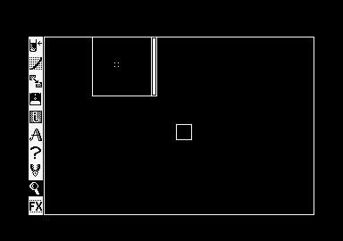 Naturally, you'd like to be able to draw a picture over the whole screen, wouldn't you? Sorry guv, no chance: there's a permanent menu bar on the left, and it can't be removed for the area underneath to be edited. Meanwhile, if a fill accidentally leaks out of the area to be filled (quite possible!) then your whole screen will be filled: fine if there was an 'undo' function. There isn't.