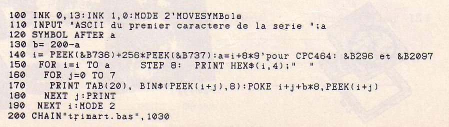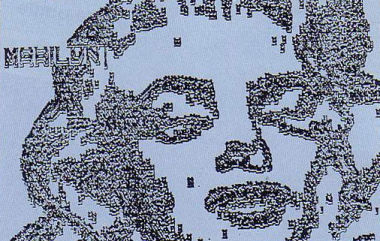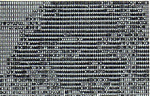 AUTRES POSSIBILITES DE TRAITEMENT Si, après avoir chargé le programme d'application pour la première fois, vous lancez l'exécution par "RUN 1030", les matrices de seuil ne seront pas créées. Les caractères correspondants, représentant les neuf niveaux de gris, ne seront ni créés ni positionnés à la place des caractères standard ASCII 200 à 208. Néanmoins, vous pouvez utiliser la fonction de régionalisation. A la place des niveaux de gris la routine placera les caractères standard, mais toujours en fonction de la moyenne locale. La figure n° 24 montre ce cas. Il est donc possible de remplacer l'image binaire par le texte. Pour pouvoir faire le choix de caractères, nous vous proposons un petit additif au programme d'application. Saisissez ces quelques lignes du listing n° 2 BASIC et sauvegardez-les sous le nom "MOVESYMB", sur la disquette comportant le programme principal. A l'allumage (ou après RESET) de la machine lancez "MOVESYMB". Le programme vous demandera le code ASCII du premier caractère de la suite des neuf qui seront utilisés. Pour utiliser les caractères A à Lie code à donner est celui de la lettre A, donc ; 65. La figure n° 25 représente l'image d'origine après la régionalisation par les lettres A à I. Compte-tenu du coefficient de remplissage de ces caractères, qui ne sont pas forcément dans l'ordre croissant, l'Image obtenue ressemble plus à l'Image Inverse qu'à l'original. Pour améliorer l'aspect, il faut choisir le bon Intervalle ou inverser la vidéo. C'est le cas de l'image n° 26, utilisant les chiffres 0 à 8, encre blanche sur fond noir.