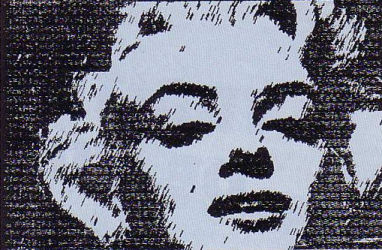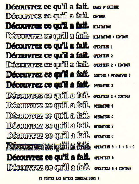OPERATEURS DIRECTIONNELS Pour aborder ce vaste domaine, rappelons le rôle des opérateurs directionnels : avantager une ou plusieurs directions dans le cas de l'expansion des régions (dilatation). Les mêmes opérateurs désavantagent les mêmes directions dans le cas de l'érosion. Notre programme d'applications agit toujours en expansion (test OR). Il est possible de le modifier (test AND), pour le faire agir en érosion. Le sous-menu de ia fonction "opérateur" affiche treize shémas du voisinage immédiat figurant l'effet de différents opérateurs. Chaque shéma porte un numéro de code, de 1 à D (HEXA). Il suffit de donner le code pour déclencher l'action de l'opérateur. Les effets des opérateurs peuvent être combinés entre eux et avec tous les autres traitements. Les textes se prêtent particulièrement bien à ce traitement et l'effet sur un texte est peut-être plus facile à cerner. La figure n° 17 montre un ensemble de dessins représentant toujours le même texte, mais après un traitement différent, et accompagné d'un nota identifiant les fonctions utilisées. Tous les opérateurs ne sont pas représentés, fauta de place ; quant aux combinaisons, elles sont innombrables. Les opérateurs sont très utiles pour le traitement des portraits, des natures mortes et même des paysages. Ils permettent de modifier non seulement la forme , mais aussi la "pacture" des images scannérisées. Ceci est très important, car une image photo peut être transformée en dessin, peinture, croquis, graffitis, etc. en simulant la technique voulue. Prenons le cas de l'opérateur n° 3. L'expansion des régions de l'encre se fera conformément au shéma, selon la diagonale de bas en haut et de gauche à droite. Cet exemple est montré sur la figure n° 18. Le portrait semble être exécuté au crayon par fines touches. Le gros feutre ou le petit couteau de peintre peuvent être simulés par l'emploi successif des deux opérateurs n° 3 et n° 5 (figure n° 19). Les coups de crayon du traitement précédent peuvent être accentués par un deuxième passage de l'opérateur n° 3 (figure n° 20). L'effet de mosaïque est obtenu par la suite des opérateurs 9, A, B, C (figure n° 21).