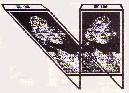 La perspective axonométrique n'est pas une routine de traitement de l'image à proprement parler. Couramment utilisée par les artistes de la vidéo (et autres), elle mérite d'être connue. De plus, l'occasion est trop belle : en modifiant et en complétant légèrement les sous-routines de décalages déjà programmées, nous obtiendrons les routines adéquates. GENERALITES La perspective axonométrique est la projection orthogonale sur un plan oblique aux trois dimensions de l'objet à reproduire. Que dites-vous ? Pas assez clair ? Essayons autrement. Examinez la figure numéro 1 représentant un panneau publicitaire en verre dans son support en tubes métalliques. Son ombre au soi, visible en partie directement et en partie par transparence est sa perspective axonométrique. Comme l'objet semble être vu d'une certaine hauteur, cette perspective est aussi nommée «cavalière». Est-ce maintenant plus clair ? Oui, mais... où sont les points de fuite et pourquoi les lignes qui s'éloignent ne se rapprochent-elles pas ? Disons que les points de fuite sont si loin, que les lignes parallèles dans la nature restent parallèles en perspective. Mais assez de théorie ! Voyons plutôt comment créer les routines et comment les utiliser. PROGRAMME D'APPLICATION «TRIMPERS» Comme pour les routines que nous avons déjà étudiées, le programme d'application est écrit en BASIC. Il est fait dans le même moule que le programme «TRIMART». Toutes les routines de base (lecture, écriture, transferts. Inversion, écran affiché...) sont conservées. Par contre, les traitements sont supprimés et remplacés par la perspective et les relations logiques entre deux écrans. Il reste suffisamment de place pour que vous puissiez ajouter vos propres applications.  Figure 2