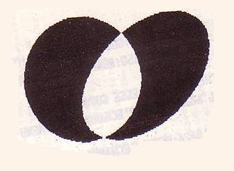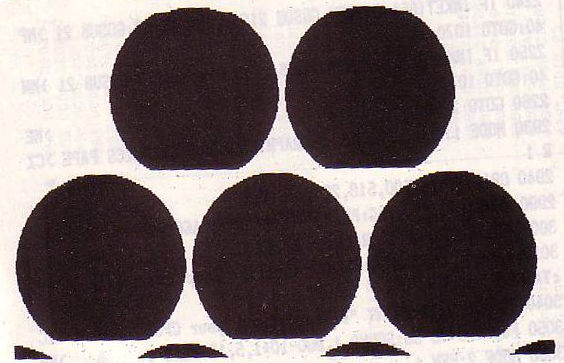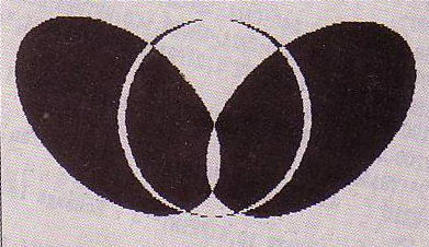 Vous pouvez aussi choisir de combiner tout de suite la perspective et l'image d'origine en optant pour «OR» (figure 5), «XOR» (figure 6), ou «AND» (seul le triangle d'Intersection des deux images, de couleurs inverses par rapport au «XOR» sera visible). L'option «Combinaisons» du menu principal vous donne la possibilité de combiner de même manière deux images quelconques, placées sur les deux écrans. Les combinaisons sont très utiles, principalement pour la création des motifs géométriques, par la perspective ou par les décalages successifs de l'image. (Voilà l'occasion pour ajouter votre propre application !). Le principe d'un tel traitement vous est donné par les figures 7 et 8. La figure 7 représente un rond «solide noir» après le traitement par la perspective «à droite» avec «XOR». Dans le cas de «AND» à la place de «XOR», seule la partie blanche en forme de la feuille de laurier serait visible et noire. La figure 8 est la perspective «à gauche» avec «XOR» de l'image de la figure 7. Les figures 9 et 10 représentent l'image d'origine et l'image finale obtenue par deux perspectives «droite» et «gauche» avec «XOR» assemblées par «OR». Imaginez ce que pourrait donner une multitude de ronds (ou autres figures, régulières ou pas), traitées convenablement.  Figure 6
