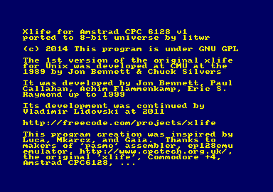 Xlife-8 is a port of 32/64-bit cellular automaton (artificial life) laboratory program. Now it has features which allow conveniently to create new life forms. Of course, it supports the famous Conway's game of life. It is maybe the fastest for 8-bit computers. It has open sources. The disk images, sources, library of patterns, screenshots, links to youtube's videos are at http://litwr2.atspace.eu/xlife/xlife4cpc.html - it at the free hosting...