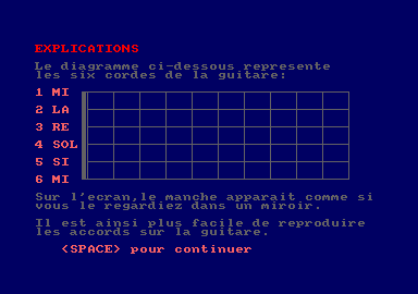 Guitaristes en herbe qui avez la chance extraordinaire de posséder un AMSTRAD, développiez votre sens harmonique par ce véritable recueil (visuel et sonore) de 192 accords des plus simples aux plus compliqués. HEBDOGICIEL n°123