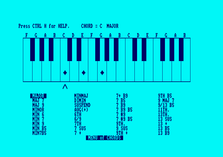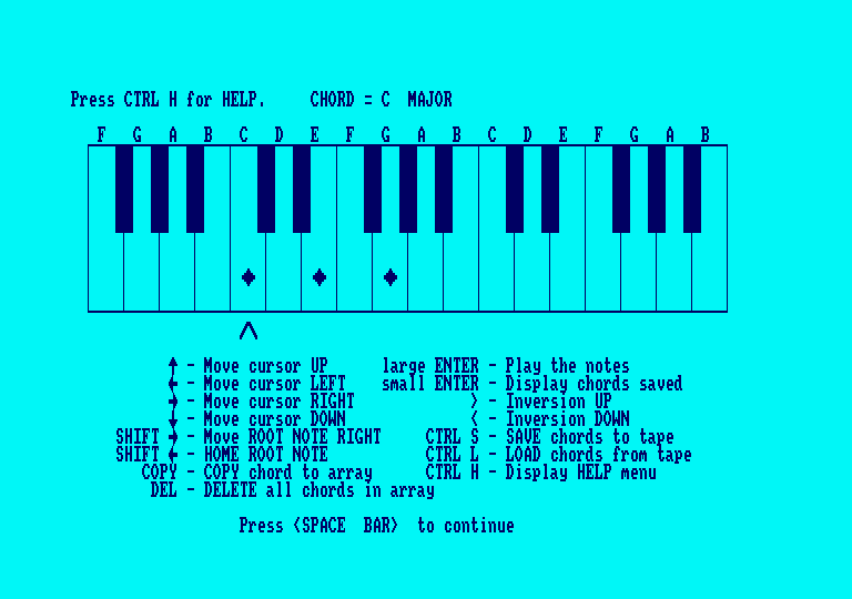 Chord Finder shold prove invaluable to keyboard players. Over 2,000 chords can be displayed, including some of the more 'modern' ones. As well as displaying the chords, up to 36 chord shapes can be saved to tape and loaded in when required. This is especially useful where the chord shapes for a particular song need to be shown complete with the correct inversions. Operation The program consists of two main displays. The keyboard display is present at all times, but the lower half of the screen can be toggled between displaying the 'MENU of CHORDS' available, and the 'CHORDS SAVED' by pressing the small key on the numeric keypad. The chord shapes are selected by using the four cursor keys to place the large cursor over the required chord name. The root note of the chord is shown by the large up arrow sign directly under the keyboard. This can be moved in one direction only - to the right - by using the shifted right cursor key. The shifted left cursor key will 'home' the root note cursor to the C key. Chord inversions up and down can be displayed by using the > and < keys. To play the notes of the chord, press the large key. Because many of the chords will consist of 4 notes, it is not possible to play the actual notes simultaneously as the sound chip is restricted to 3 channels only. It's about time the chip manufacturers produced a 4 channel sound chip! To save any chord to the second screen display, press the COPY key. You are then prompted to press any key from 0 - 9 or A - Z, giving total of 36. When you have saved some chords press the small key, and the chords saved will be displayed. Moving the cursor as before over the required chord will display the chord as originally saved, and the notes will also be played. To save the screen of 'CHORDS SAVED' to tape, return back to the 'MENU of CHORDS' screen and press the CTRL and S keys. You will asked for the filename that you wish to give to the 36 chords saved and then these will be saved to tape as a file in the normal manner. You do not need to use up all 36 spaces on the 'CHORDS SAVED' screen before saving them to tape - unused spaces will be saved as — Previously saved chords can be loaded back into the program by pressing the CTRL and L keys. At all times a Help menu is available for both of the screens by pressing the CTRL and H keys. These will list all the operations of the various keys. Most of the operations are accessed when the 'MENU of CHORDS' screen is in operation. Pressing the DEL key will erase any chords currently saved. This is done by issuing the RUN command so be careful not to press it in error. You should find the program simple to operate thnks to the ue of the 'floating cursor'. Notes for Musicians There is a lot of confusion over chords symbols — different publishers use different characters — sometimes correctly — more often than not incorrectly! Some of the common misunderstandings are:
