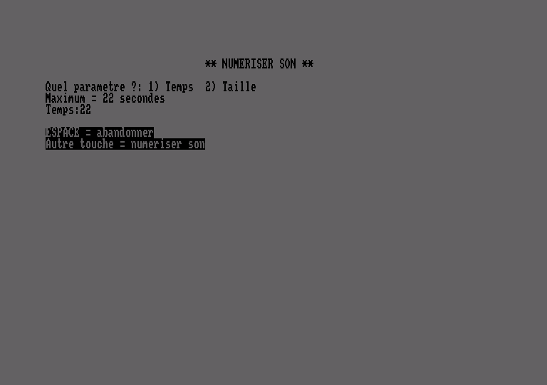Pour commencer : Tapez DIGISON et MODISON puis sauvez-les.Tapez ensuite DIGI et MODI, sauvez-les et lancez-les. Ils vont créer deux fichiers : "DIGI.BIN' et mMODI.BIN Enfin, tapez RELOGE et ASS-DEC qui vous serviront plus tard. Description des 2 principaux programmes : — DIGISON : Il charge d'abord "DIGI.BIN" en &A000(= 40960), puis affiche son menu. Vous avez alors le choix entre NUMERISER SON, ECOUTER SON et SAUVER SON. Pour la commande NUMERISER SON, vous avez à choisir entre deux paramètres : le TEMPS et la TAILLE mémoire. Pour vous aider, sachez que : 1 seconde = 1429 octets (le maximum est de 22 secondes) 10000 octets = 7 secondes (le maximum est de 32760 octets) Le programme DIGISON mettra en marche automatiquement le moteur du lecteur de cassette à chaque utilisation de la commande NUMERISER SON et le coupera à la fin. Aussi, si vous utilisez le boîtier DIGISON modifiez la ligne 100 comme suit : 100 GOSUB 160 : CALL &A070, &2000, T : RETURN De môme, à chaque appel de la commande SAUVER SON, Il vous sera demandé la vitesse de sauvegarde. Aussi, si vous voulez sauvegarder sur disquette, modifiez la ligne 140 comme suit : 140 LOCATE 32, 1 : PRINT"** SAUVER SON **": CALL &BB03 — MODISON : Il charge d'abord "MODI.BIN" en &A000 (=40960), puis vous demande si vous voulez charger un fichier. Dans ce cas, pensez à Insérer la disquette contenant le fichier avant de valider votre réponse. Le catalogue de cette disquette apparaîtra (sur cassette appuyez 2 fols sur (ESC) pour l'arrôler) et le programme vous demandera le nom du fichier à charger. Après avoir ou non chargé un fichier vous devez Indiquer combien d'octets vous voulez pouvoir visualiser en même temps (vous avez le choix entre 2,6, 12 et 20). Ensuite, M faut entrer l'adresse de début de visualisation (les valeurs entre crochets sont les valeurs par défaut). Sur votre écran s'affiche alors un graphique représentant l'état de chaque bit des octets 01 y en a 2,6,12 ou 20) à partir de l'adresse que vous avez Indiquée auparavant (le bit le plus à gauche d'un octet est le bit 7, et le bit le plus à droite le bit 0). Vous vous trouvez alors dans le MODE OCTET, et vous avez les commandes suivantes à votre disposition : - FLECHE GAUCHE : Déplacement à gauche de 2,6,12 ou 20 octets.
