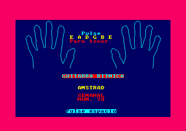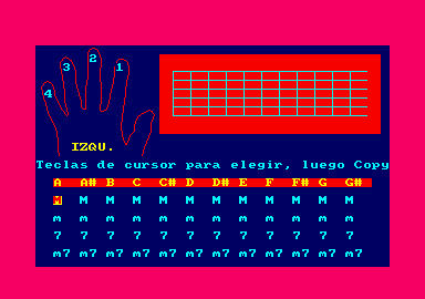 Todo esto lo logra de una manera fácil y sencilla de aprender, por lo que nosotros recomendaríamos, una vez con el programa en el ordenador, coger la guitarra y seguir al pie de la letra las indicaciones que nos sean hechas para poder tocar todos los acordes apropiadamente. También puede ser sumamente útil el programa para tener afinada correctamente nuestra guitarra, ya que reproduce el sonido de cada nota —pensamos nosotros que apropiadamente—, esté en mayor, menor, séptima o séptima menor. Para seleccionar una nota, nos deberemos mover con las teclas del cursor hasta que lleguemos a la que queramos ver y oír. Una vez allí pulsar la tecla COPY y a continuación oiremos el sonido melodioso de la nota; además de ver en pantalla la posición que deben tener los dedos de la mano izquierda sobre el tastre de la guitarra. Como se puede ver, el programa es útil e instructivo. Este programa puede ser un “arma” importante si aprovechamos algunas de sus ideas para el concurso musical de AMSTRAD Semanal.