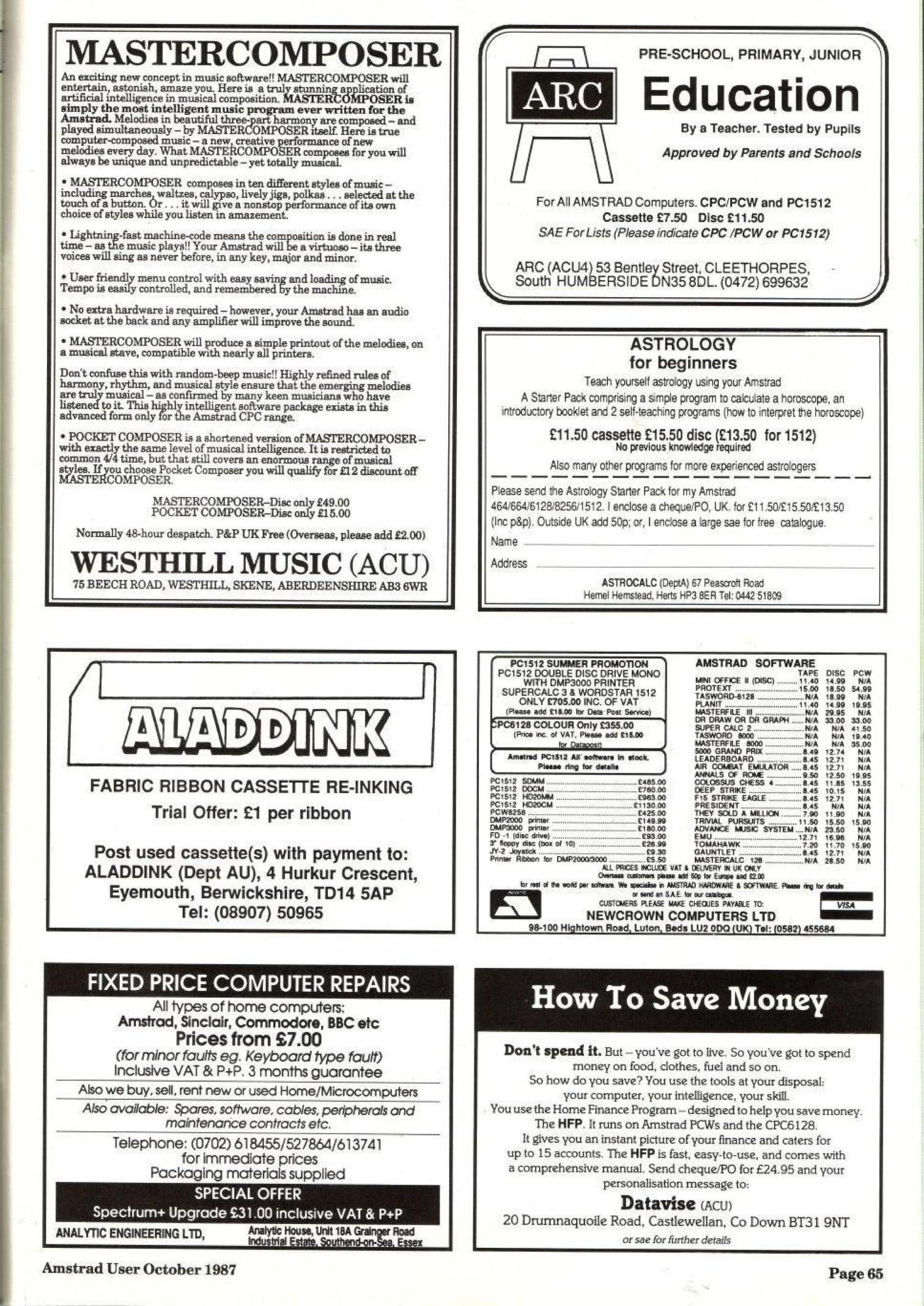 Music program for Amstrad CPC WESTHILL Music are claiming a first by releasing 'An Unusually Intelligent Music Program' for the Amstrad CPC. Mastercomposer is a new development in artificial intelligence and allows you to compose original melodies in three-part harmony. The package is claimed to be easy to use and there is no need to enter any musical notes. The program is the brainchild of Dr Brian James who has spent the last 7 years planning the program and also doing research into music theory. Dr James says that the program started life on the Sharp MZ80K computer and that he has spent the last 3 years refining the program on the Amstrad CPC. According to Dr James, “The program is aimed at anyone who owns an Amstrad CPC and has an interest in music, though they don't need to be professionals to use the program." There are ten styles of music that the user can have, these include jigs, waltzes, polka, march and calypso. The program costs £29 on tape or disc from Westhill Music, Aberdeenshire AB3 6WR. For further details contact Dr James on 0224-740***.