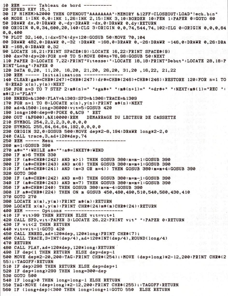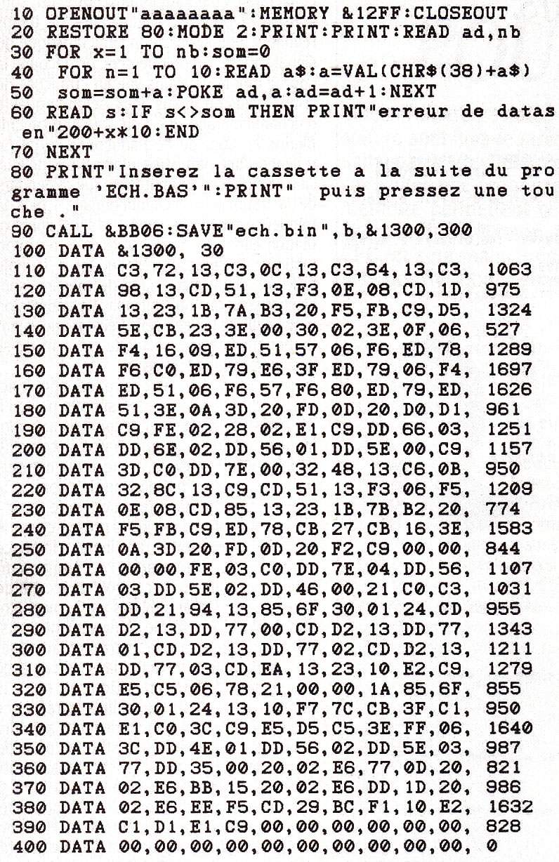 Si les ordinateurs dotés en standard de véritables possibilités de synthèse sonore sont encore rares, tous sont en théorie capables de reproduire des sons, par les techniques dites d'échantillonnage. En théorie uniquement, car seules une programmation en assembleur et une importante capacité mémoire permettent cette technique. Le programme proposé par notre gagnant Hervé Masson, étudiant à l'INSA de Lyon, fonctionne sur Amstrad CPC, et sera malheureusement difficilement adaptable à un autre micro, sans une très bonne connaissance interne de la machine visée.L'ECHANTILLONneur est un appareil bien connu dans les studios d'enregistrement de musique. On le trouve très souvent associé à des instruments à la norme MIDI, dont il permet de retravailler les sons. Pour illustrer ses possibilités, enregistrons sur un magnétophone un son de fréquence fixe, à une certaine vitesse. Si l'on fait varier la vitesse à la lecture, on pourra, à partir de ce son original, produire des sons de différentes fréquences, voire reconstituer une gamme entière. Un échantillonneur a une fonction qui ressemble à celle d'un magnétophone, à ceci près que les sons sur lesquels on travaille sont numérisés, suivant les techniques classiques de la conversion analogique-numérique. Un son analogique peut être représenté sous forme graphique par une courbe rendant compte de la durée (l'axe des abcisses) et de la fréquence (l'axe des ordonnées) (figure 1). L'échantillonnage (ou si l'on préfère la conversion analogique-numérique du son) consiste à prélever, à intervalles de temps réguliers, une information caractéristique du signal sonore. Graphiquement, on découpe la courbe que nous avons vue en « tranches de temps « plus ou moins fines, selon la qualité d'échantillonnage que l'on souhaite obtenir (figure 2). Lors de l'échantillonnage, on ne retient qu'une partie des informations définissant le signal, la quantité retenue dépendant de la fréquence d'échantillonnage : plus la fréquence est élevée, meilleure sera l'approximation effectuée. Sur le schéma 3, les informations retenues correspondant à l'amplitude du signal aux points de mesure, sont symbolisées par un trait noir. La conversion numérique se fait enfin en affectant une valeur numérique précise à chaque élément de signal échantillonné (figure 4). Dans notre cas, l'échantillonnage fonctionne d'une manière plus simple, puisqu'il n'y a pas lieu d'effectuer la conversion analogique-numérique : le programme se contente de lire sur une cassette, à une fréquence plus ou moins élevée (qui dépend du choix de la vitesse, effectué dans le programme Basic), les informations numériques présentes sur le port B d'entrée-sortie du circuit d'interface parallèle de l'Amstrad CPC, composant chargé entre autres du contrôle du lecteur de cassettes. Le signal transmis par le magnétophone arrive sous forme d'une série de 8 bits, puis est rangé à une certaine adresse. L'échantillonneur travaille dans ce cas avec des signaux à deux états (tout ou rien), le nombre de bits 0 ou 1 étant lié à la fréquence du signal. Il ne faut évidemment pas attendre d'une telle méthode une restitution parfaite, mais elle s'est révélée assez satisfaisante pour les applications envisagées. Le port C d'entrée-sortie sert à contrôler le fonctionnement du moteur du magnétophone, et le port A règle le volume sonore. La routine graphique se trouve en fin de programme, le signal enregistré étant restitué en direct, exactement comme s'il était observé sur l'écran d'un oscilloscope. Cette routine pourra être supprimée si Ton désire seulement utiliser l'échantillonneur pour un jeu. Les trois listages fournis concernent respectivement le programme principal, qui charge le programme assembleur, gère l'utilisation des touches et l'image écran ; le chargeur de DATAS qui contient les codes du programme assembleur, avec le « checksum » de vérification ; le code-source du programme assembleur, abondamment commenté afin de pouvoir être modifié ou réutilisé sans problème. Il ne vous reste plus qu'à entrer les deux programmes Basic dans votre Amstrad, et à écouter attentivement les résultats obtenus, sur une voix, une musique classique, ou des bruitages plus contemporains. ECHANTILLOMEUR DEUX ETATS. Pour utiliser le programme Echantillonneur, il faudra tout d'abord taper le premier programme Basic, puis le sauvegarder sur cassette ou disquette sous le nom ECH.BAS. Puis on tapera le programme Basic de création du module en langage machine (intitulé chargeur de DATAS), que l'on devra lancer séparément pour pouvoir créer le fichier ECH.BIN. Sur cassette, il sera nécessaire de sauvegarder le fichier ECH.BIN juste à la suite du programme ECH.BAS. Le chargeur de DATAS pourra ensuite être supprimé. On lance le programme ECH.BAS, qui va lui-même charger les données contenues dans le fichier ECH.BAS. On obtient alors sur l'écran la représentation d'une sorte de magnétophone, avec deux touches PLAY et REC, ainsi que diverses flèches qui ressemblent un peu aux touches de défilement rapide (ce n'est pas tout à fait leur signification ici). Pour pouvoir échantillonner un son, il faut tout d'abord qu'il soit disponible sur une cassette introduite dans le lecteur, intégré pour le CPC 464, externe pour les 664 et 6128. On devra donc au préalable enregistrer de manière traditionnelle sur une cassette environ 20 à 40 secondes de son à numériser, parole ou musique. Une fois la bande placée dans le lecteur, on échantillonne le son en actionnant la touche REC du magnétophone représenté à l'écran. Les touches sont accessibles par les flèches de déplacement du curseur, et la validation se fait avec la touche COPY. Il est possible de régler la vitesse d'échantillonnage, 1 correspondant à la meilleure qualité possible (on découpe le signal en tranches très fines) et 99 au minimum d