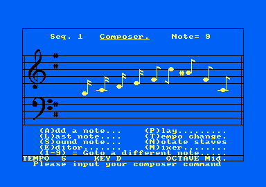 To start with, it is a useful utility for people who not only want to compose music, but also for those who, lacking a musical ear, want to hear how a piece of sheet music should sound. For that reason we should be thankful that it conforms roughly to normal music notation, covers a range of three octaves (although it should have been the seven that the machine is capable of), has a wide choice of keys that can be altered during composition, and allows a large number of notes to be stored in memory (up to 1,000 for a single tune). Entering a tune note by note is pretty easy, taking from between 3-5 key presses to specify octave, note and duration, but editing them if you change your mind is a slightly more complicated and slower process.