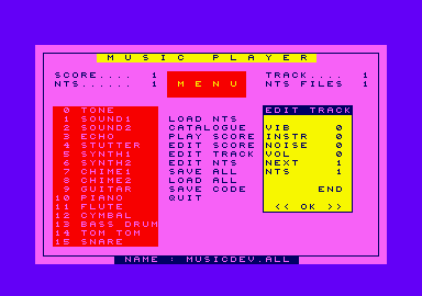 Special programming techniques have been employed to achieve these objectives: the sound module runs as a second process with a higher priority than any foreground program so as to maintain correct timing. The sound module also performs resource management for the three channels of the sound chip allowing any combination of channels for music and sound effects: music channel(s) will 'cut-out' for the duration of an effect which uses the channel(s).Other features include: - Up to 31 tunes (Scores) each using up to 3 channels
