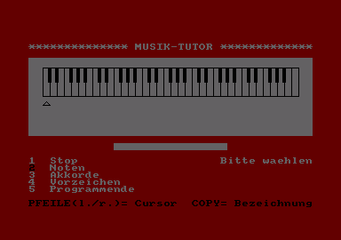 Haste Töne? Interessieren Siesich für Musik? Auf einem Instrument zu musizieren ist gar nicht so schwer. Lassen Sie sich von Ihrem CPC beim IJ ingang mit Noten und Klaviatur unterstützen. Der “Musik-Tutor” ist eine Art programmierte Lernhilfe für Noten und Akkorde. Natürlich will er keine ordentliche musikalische Ausbildung ersetzen. Vielmehr soll das Programm eine Anregung dazu geben, sich einmal etwas näher mit der Musik zu beschäftigen. Also bitte jetzt nicht gleich den Klavierlehrer davonjagen und mit der vorhandenen Musikliteratur eine Bücherverbrennung inszenieren. Außerdem ist das CPC-Programm im Gegensatz zu einem menschlichen Nachhilfelehrer taub und stumm. Dennoch kann mit dem “Musik-Tutor” jeder, der schon ein wenig von den Noten und der Notenschri ft weiß: -Klaviaturen verstehen lernen -Noten lesen lernen -Gesangsübungen durchführen -Akkorderkennung iiben - Akkordgriffe einstud ieren oder -Tonarten bestimmen. Nach dem Ladevorgang und einer kurzen Einblendung des Copyright-Vermerks erscheint der Arbeitsbildschirm des Programms. Er bleibt mit seinen Der CPC als Lehrer Das Programmenü besteht aus fünf Punkten. Bei Punkt 1 hat man die Möglichkeit, die Tonausgabe, die beim Start des Programms ertönt, ein- oder auszuschalten. Unter Punkt 2 wird es ernst. Hier wird, wenn man die Taste [J] drückt, eine fünfoktavige Klaviatur dargestellt. Mit den Pfeiltasten läßt sich ein Cursor unter dem Tastenfeld hin- und herbewegen. Durch Druck auf [COPY] erfährt man dann, welcher Ton auf der entsprechenden Taste liegt. Wählt man die Darstellung in Notenschrift, so hat man zusätzlich die Gelegenheit, sich die Töne mit der Pfeiltaste [Auf] anzuhören oder den Kammerton a' mit der Pfeiltaste [Ab] ausgeben zu lassen. Unter Menüpunkt A werden rein zufällig ausgewählte Noten zur Viele Schlüssel und doch kein Schloß Bleibt noch Punkt B zu nennen. Seine Anwahl veranlaßt den CPC, eine Tonleiter auszugeben. Mit Hilfe dieser Tonleiter kann man zum Beispiel Gesangsübungen durchführen. Man läßt sich zunächst durch den Druck auf die Pfeiltaste <Ab> den Kammerton a' als Orientierungshilfe Vorspielen, fährt dann mit dem Cursor unter eine beliebige Note und versucht, den entsprechenden Ton zu singen, bevor man sich durch Druck auf die Pfeiltaste [Auf] den richtigen Ton vom Rechner melden läßt. Akkorde lassen sich nach bestimmten Regeln aus Tönen verschiedener Höhe zusammensetzen. Jeder Akkord besteht aus mindestens drei Tönen. Solche Dreiklang-Akkorde stehen unter Punkt 3 des Menüs zur Auswahl. Man entscheidet zunächst wieder über eine Notenausgabe im Violin- oder Baßschlüssel. Wählt man dann den Punkt A an, gibt der CPC eine zufällige Folge von dreistimmigen Akkorden (C, Dm, Ern, F, G, Am und H - oder englisch B -) aus. Wieder hat man die Möglichkeit, mit dem Cursor unter die einzelnen Akkorde zu fahren und sich durch Druck auf [COPY] die korrekte Akkordbezeichnung nennen zu lassen. Der Druck auf [DEL] bringt eine neue Zufallsfolge von Dreiklängen auf den Bildschirm. Wählt man Punkt B an, so erscheint nach kurzer Zeit der Ausschnitt aus einer Klaviatur im Ausgabefenster. Eine der Tasten enthält den Buchstaben c zur Kennzeichnung. Das bedeutet, daß man sich hier in der Kleinen Oktave einer Klaviertastatur befindet und unter der bezeichneten Taste der Ton c liegt. Durch Bedienung der Pfeiltasten [Links]/[Rechts] kann man nun im kleinen Ausgabefenster einige Begleit-akkorde für die linke Spielhand anzeigen lassen. (Solche Akkorde sind bei spielsweise geeignet, um ein Keyboard mit ßegleilautomatik zu spielen.) Ein Tastendruck auf [COPY] läßt den CPC den gewählten Akkord auf der Klaviatur darstellen. Die Zahlen eins bis fünf geben dabei die Lage der notwendigen Töne auf der Tastatur an und nennen einen möglichen Fingersatz (1=Daumen, 2=Zeigefinger, 3=Mittelfinger, 4=Ringfinger,5=kleiner Finger). Ein Akkord, aber viele Finger Wichtig ist noch, daß im großen Anzeigefenster oben links immer der als Fingersatz dargestellte Akkord (teilweise abgekürzt) benannt wird. Dadurch ist ein schnelleres “Blättern” im kleinen Ausgabefenster möglich. Der richtige Akkord wird nur dann angezeigt, wenn die Bezeichnungen im kleinen wie im großen Ausgabefenster (links oben) übereinstimmen! Die dargestellten Akkorde reichen aus, um eine Vielzahl von Musikstücken in allen Tonarten spielen zu können und dürften für den Anfang wohl genügen. Vordem letzten Menüpunkt, der lediglich das “Musik-Tulor”-Programm beendet und das BASIC-Programm auflistet. kommen wir noch zum Punkt 4 des Menüs. Es besteht wieder die Möglichkeit, die Zeichenausgabe im Violinoder Baßschlüssel festzulegen. Danach gibt der CPC einige Vorzeichen-Notierungen aus. Ein Kreuz (#) erhöht eine nachfolgende Note um einen halben Ton, und ein b erniedrigt die folgende Note um den gleichen Betrag. Musiker bezeichnen die Zeichen als “Versetzungszeichen”. Stehen diese am Anfang eines Notensystems, so gelten sie jeweils für die gesamte Zeile. Mit den Pfeiltasten [Links]/[Rechts] kann man nun, wie gewohnt, die Vorzeichengruppen anfahren. Durch einen Tastendruck auf [COPY] erfährt man, wie die entsprechende Tonart heißt. Der “Musik-Tutor” soll ein Werkzeug für Anfänger darstellen. Er erhebt nicht den Anspruch auf Vollständigkeit. Dies wäre aufgrund des riesigen Detailreichtums der Musik auch nur mit großem Aufwand zu realisieren. Wir wünschen viel Spaß beim Lernen mit CPC und “Musik-Tutor”!