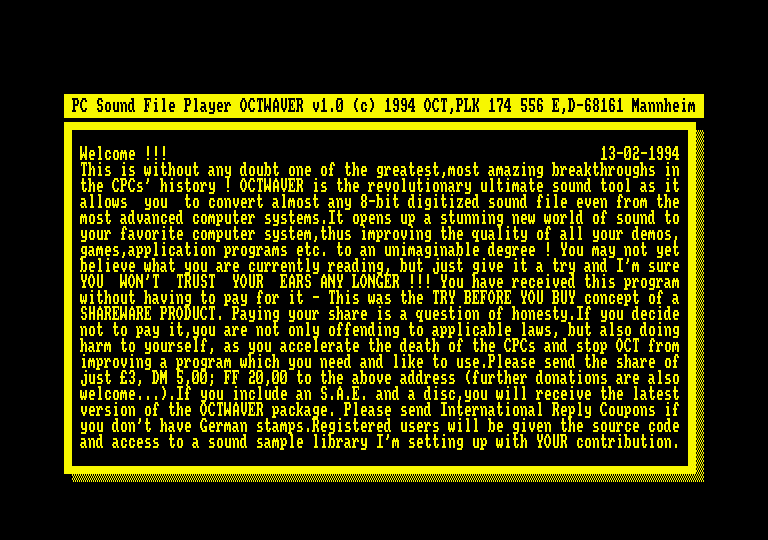 Octwaver is a rather nifty little program for playing PC sounds on your humble CPC. It's a bit like Digitracker, which was reviewed in AA100, only instead of transferring music modules from the Amiga, this program transfers high quality sound files from the PC. Octwaver is very simple to use. All you have to do is to load your PC sound samples into the program, then it does the rest. Both binary files and ASCII files can be used, although a major drawback is that files that don't fit into the normal CPC RAM cause a crash - the program makes nc use of the 6128's second 64k. The 8-bit samples of the PC are. of course, reduced to 4-bit samples when used through the CPC's internal speaker, which does sometimes result in a slight loss of quality. Even so, the results are absolutely outstanding. They are certainly light years ahead of the 1-bit samples produced by the tape samplers we're used to (which are, in comparison, nothing but a load of noise). Octwaver is a shareware program and you'd be well advised to pay the tiny sum of £3 as many benefits will be bestowed upon such honest people. Not least of these is the author's offer to give free PC sound and conversion tools to registered users. Many samples contain control characters which can cause considerable problems when used in AmsDOS. By using the pre-processor under MSDOS PC such problems are avoided. For true sound fanatics its also possible to purchase a gadget called a Digiblaster for only £15, which allows you to play incredible 8-bit sound samples on your CPC. The really useful thing about all this is that it's very easy to play the samples in your own programs, using any delay (change in the sample's speed) you want. As well as the full English instructions, an example program is included to show you how to do this. Octwaver is probably the best new utility to be released this year. You really will not be able to believe that these hieh aualitv sounds are Amstrad Action