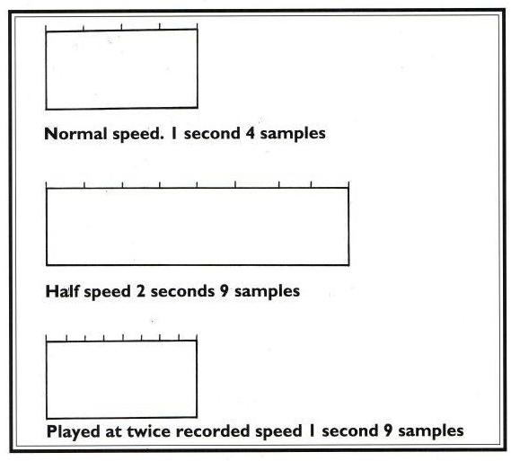 A follow up on Digitising by Master Nick Hutton. Hopefully those ofyou who typed in the Digitiser listing in the May edition of ACU will now have fully debugged , working copies secreted amongst your Disk collection. You should now be familiar with the listing's operation and eager to utilise it's output in your own programs. In it's current form it is not the easiest little subroutine to add to your programming masterpiece. The first step to using the program in your own listing is to get it into a neat and more memory efficient form, a Binary file, (gasp of horror). To accomplish this mind blowingly d ifficult operation you must first have a completely bug free, fumigated program, & la ACU May. Run the Digitiser program as it appears in the magazine, we now need to get into BASIC by pressing ESCAPE twice, not by selecting option five on the Menu, dummy. Next, just enter the following short linesof BASIC, making sure you have a Disc with a couple of K free in the built in pop up toaster. (That reads Disc Drive for those with a limited sense of humour). SAVE "DIGICODE.BIN”,B,&A0OO,&208Finished already? You should now have a Binary file on Disc of approximately 1K in length, if not, consult your Bank Manager or Local M.P. The program is now in a much more portable form.To incorporate it in your latest moneyspinner just add the following lines at the start of your program which form a short loader. 10 H=HIMEM 20 IF H=36863 THEN 60 ELSE 30 30 MEMORY &9FFF 40 LOAD “DIGICODE.BIN",&A000 50 CALL &A000 60 MEMORY “Start address minus 1” 70 LOAD “SOUND.BIN", start address, length 80 REM Start of your ProgramThe loader incorporates a short routine which makes sure that the Digitiser is not loaded-in more than once, which means that every time you alter your program and then run it, you won't have to wait for the Binary file to load again. (We don't neglect Tape users here at Amstrad Computer User).Line 70 will load in the sample you have recorded previously with the Digitiser. You should amend the details of this line, eg: file name, start address and length, to suit your own sample, which should be saved on Disk or Tape. You must also change line 60 to reserve the correct amount of memory for your sample. For example if my sample started at &2000 the statement in line 609 should read: MEMORY &1FFF (We can't all count in Hexidecimal). With patience, and more than a bit of luck, both the Digitiser code and your sample should be safely in the computer's memory and ready for playing. To play a sample you must enter the RSX instructions into the desired lines of your program, no more friendly menu I'm afraid. Playing a sample is really very simple if you can remember the start and end addresses. The following line will play your sample. |PSOUND, START ADDRESS, END ADDRESS, VOLUMEOnce again please amend the line to suit your sample's details. It is of course possible to record sound from within your program in a similar manner using the RSX |RECORD.As soon as the RSX has been issued with the correct parameters, and your sample has been played, command will be returned to your own basic program and the next instruction will be carried out. At this point I feel that I must remind you that you shouldn't sample a sound from say, a music cassette, without first seeking permission of the copyright holders for that piece of music. (I won't tell if you won't). I expect that many of you are wondering why your samples are not as clear as those on say, Chase HQ or Shinobi. Well, the secret to a clear sample is all in the speed of data sampling and bits per second. The trick is to cram as many sampled bits as possible into each piece of analogue sound. The more pieces of sound the com-putertakes in the smoother the sample. Your samples sound rather harsh because the computer does not take in every single piece of data on your audio tape, it only remembers an evenly spread section of sound, hence the somewhat crackly nature of playback. So what we need is to find some way of squeezing more data into each sound the computer reads. After some careful thought I deduced that there was a way of increasing the perceived sampling rate and so clarifying the digitised sound. Before 1 continue, 1 should explain that the following procedure for digitising sound will only work on First Bytes Digitiser as the listing in the May issue of ACU doesn't have all the required functions. (Whaddya expect for 1K of code?) Firstly, we must slow the analogue sound down to half speed, your cassette recorder may have a half speed setting. Make sure your sound is at half speed before sampling it in. Then set the recording speed option to normal speed, and record your sample. Next, once your sample is in memory, select the playback speed setting and set it to twice normal speed. When your sound is played back it should be much clearer. This is because it contains twice as much digital data as the original sample and is therefore twice as clear, theoretically. (The diagrams should help explain the mechanics of the operation) It is also theoretically possible to keep on slowing down the speed of the analogue data “ad infinitum" but a “half speed ratio" should be quite sufficient for your purposes. And on that last note I conclude my little expedition into the outwardly baffling subject of digitising. ACU | Cramming in the data Each red dot represents a sampled bit of data. The length of each rectangle is proportional to the length of analogue tape that the sound would take up and therefore the overall amount of time it takes for the sample to play. Closer examination of the process reveals that it is possible to cram in twice the sampled data or bits, into a sample of the same perceived length as a sound of normal speed. This means that the sample uses twice as much memory as a normal one, the only drawback. |