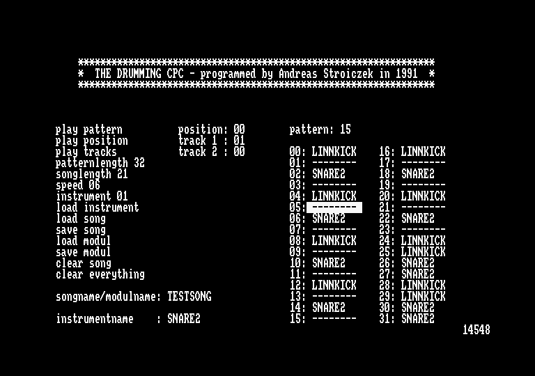 Der CPC als Schlagzeug Digitalisierte Sounds sind auf dem CPC recht selten anzutreffen. Dali die Ausgabe solcher Samples dem CPC keine Schwierigkeiten bereiten, haben wir schon mit dem CPC-Digiblaster aus der Ausgabe 8'9/91 bewiesen. Doch damit nicht genug, mit einem Rhy thmus-Sequenzer, der seinesgleichen auf Atari und Amiga sucht, geht's jetzt weiter. Der CPC-Digiblaster eröffnete eine neue Möglichkeit für den CPC: die Wiedergabe von digitalisierten Sounds. Wenn man Abstriche in der Qualität macht, so ist dies auch von Haus aus über die Lautstärkeregelung des Soundchips möglich. Es stehen für die Regelung aber nur 4 Bit und damit 16 Lautstärkestufen zur Verfügung. Dagegen sind es beim Digiblaster 8 Bit und somit 256 Lautstärkestufen. The Drumming CPC besitzt nun wahlweise beide Möglichkeiten, wobei man aber deutlich die Qualitätseinbuße bei der Soundchip-Ausgabe feststellen kann. Vorteil dieser Variante ist, daß man nicht unbedingt den CPC-Digiblaster benötigt, um das Programm nutzen zu können. Mit dem CPC-Drummer können Sie eigene Soundtracks aus vorgegebenen Samples erstellen. Hierzu wird der Soundtracks in maximal 64 Positionen aufgeteilt. Auf jeder Position können jeweils zwei Tracks (Kanäle) abgespielt werden. Die Tracks geben die Nummern des jeweiligen Pattern an. Jedes Pattern besteht aus maximal 32 Speicherstellen, in denen der Name eines Samples (Instruments) abgelegt werden kann. Möchte man sich nun einen Soundtrack zusammenstellen, geht man folgendermaßen vor: