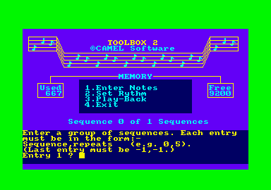 EASY PLAY Camel Software has recently issued a music program for the Amstrad called Toolbox 2. It differs from other music programs in its intention - not to teach you much about music but simply to get you in the position of playing music quickly and easily. It gives you the chance to play your Amstrad in a similar way to those Casio 'one key' facilities where after recording the sequence of notes you require, you then time them by pressing a single key in step with a rhythm unit. Each press of the key 'releases'a note of the tune. This facility is available on all three sound channels of the Amstrad and so a three pari tune is possible.