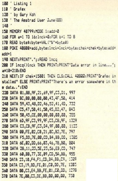 Last month we published a 464 to 6128 converter. This month Gary has produced a much smaller routine which implements the most important commands. 6128 owners have been spoilt by having a large range of graphics commands. To put this right I have produced the following program. This program will add 4 new graphics commands that are normally on the 6128 on to the 464. The new commands are implemented as RSX's. The only commands I have not implemented are the Mask and Fill command. Fill routines will be dealt with later. Mask is tricky too and is not frequently used so I have not bothered with it. The new commands are Copychr, Frame, Gpaper and Gpen. Explanations of the parameters and what each command does is detailed below the listing. The 6128 syntax of each command is a$=Copychr$(s), Frame, Graphics paper p and Graphics pen p. All you have to do now with programs that use these commands is to change the syntax. I hope this is of use to you. |Copychr,@a$,s -This command allows you to road characters from the screen. The 's'parameter is the value for which stream you want to read a character. 'a$' MUST be at least one character long. Strange things will probably happen if you pass a null string (eg. system reset). This command has been slightly extended on the 464. Normally it will read only one character but if you make aS four characters long then it will read four characters from the screen, eg. LOCATE 1,1:a$="iiiii":|COPYCHR,@a$,0:LOCATE 1,10:PRINT a$ (This will copy 5 characters from location (1,1), then print them at location (1,10)) NOTE: This routine will not work with the CPC664 or CPC6128). |Frame - This will cause a frame flyback to occur. This can be utilized to produce smooth animation. |Gpaper,p - This will set the value of the graphics paper. The graphics paper is the background of characters printed at the graphics cursor and the colour the graphics screen is cleared to. |Gpen,p -This will set the value of the graphics pen. The graphics pen is the colour that lines or points are drawn in. TAU |