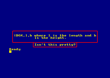 Another little routine from Jason, this one allowing you to create a box on the screen. Very handy for incorporation with other proggies this one. Run it by typing |BOX and experiment.