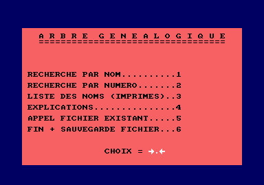 Ce programme permet cette gestion. Il utilise la méthode suivante certainement déjà connue par certains d'entre vous. Chaque individu est répertorié par un numéro d'enregistrement. S'il s'agit de votre arbre généalogique, vous êtes le numéro 1, votre père porte le numéro double du vôtre, soit le numéro 2 et votre mère, le double plus un, soit le numéro 3. Un autre exemple : le père du numéro 5 est le numéro 10, sa mère, le numéro 11 ; ce même numéro 5, chiffre impair, désigne une femme, mère du numéro 2. Cet arbre peut gérer 127 personnes, soit 7 générations, mémorisant évidemment le nom (18 positions), le prénom (18), les dates (8) et lieux (15) de naissance, de mariage, de décès, et le métier (25). Cette dernière zone, assez importante, peut être utilisée à autre chose éventuellement. Au total 130 positions sont retenues par enregistrement. Ce programme a été conçu de façon à n'avoir qu'un minimum de questions/ réponses. La plupart des manipulations sont effectuées grâce à des "touches de fonction" affichées en bas de l'écran. Les entrées elles-mêmes sont toutes verrouillées car elles utilisent systématiquement un sous-programme de saisie par "INKEY$". Vous voyez apparaître dans ce cas un certain nombre de points blancs, symbolisant la longueur maximale de la réponse, encadrés par deux flèches. Après avoir désigné la personne servant de référence, il est toujours présenté à l'écran cet individu, son père et sa mère. La personne servant de référence est toujours affichée en blanc et les deux autres en noir. Grâce à la touche "COPY", on peut visualiser de façon plus complète cet enregistrement et aussi le modifier. Le déplacement dans l'arbre se faisant, quant à lui, grâce aux flèches de direction. Toutes ces fonctions sont expliquées dans le programme lui-même : une première fois de façon très générale par le choix n° 4 du menu, les autres fois grâce à la touche "?" (sorte de Help), pour connaître l'utilisation des touches visualisées en bas de l'écran précédent. ACCES A L'ARBRE Comme décrit précédemment, il faut, pour accéder à la disposition enfant, père, mère, désigner cet enfant servant de référence au programme. Deux accès sont possibles : La recherche par le numéro : la personne ayant ce numéro est affichée succinctement dans la partie gauche de l'écran, avec évidemment son nom, son prénom, ses années de naissance et de décès, mêmes éléments pour ses père et mère dans la partie droite. La recherche par le nom : ce peut-être le nom entier et le prénom ou seulement une partie de l'un ou de l'autre ou tout simplement rien du tout. Il suffit alors de valider chaque zone à saisir pour voir défiler l'ensemble du fichier . Il n'est pas utile de répondre "N" (non) si la personne présentée ne vous intéresse pas, une validation suffit. La réponse "O" (oui) vous entraîne automatiquement dans l'arbre avec cet individu comme référence (affichage en blanc).. Dès l'instant où vous êtes entré dans l'arbre, une série de manipulations vous est proposée :