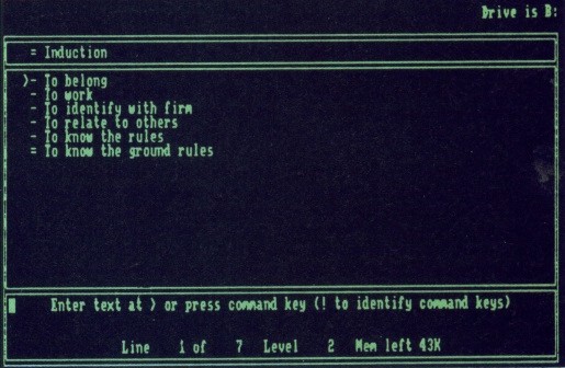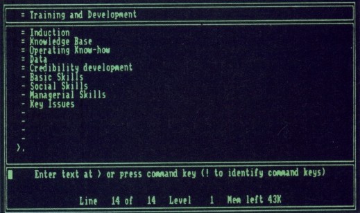 Get your mind into top gear BILL AGNEW takes a thoughtful look at Brainstorm, a program designed to produce structured ideas BRAINSTORM from Caxton is effectively an electronic scratchpad which can be used to create structured lists of items from random jottings and to show the relationship between them. Basically, you decide on a topic and make a list of the main issues, then take each of the issues and make a list of key points. Then you detail each key point, create further descendants from them, and so on. The topic, the issues, the key points, and (say) one set of details - in that case, four levels. BrainStorm will help you delve deep, planting your thoughts at each level so that they stand a chance of sprouting into other levels, while noting any ideas that recur. The result of your ideas session can be examined at any time on screen, or sent to printer - in which case BrainStorm will indent each level appropriately, thus providing a visual feedback of structure. The attractive glossy black packaging, with its logo of The Thinker really sets the mood to enjoy the program. Unfortunately, mood isn't everything, and my first twenty minutes of BrainStorm were nearly my last. My initial discovery was far from enjoyable - different meanings for the PCW's keys instead of the comfortably dedicated LocoScript set-up. To have to give up the hard-won mastery of the keyboard was hardly welcome. And in addition to getting used to an unfamiliar keyboard configuration there were a dozen or so special controls to learn - Control + D = Next, Control + H = Hunt (Search for), and so on. However, BrainStorm awaited and I persevered. On the whole, it was worth it. So, what are the benefits of this ideas processor, supposedly the greatest thing since pencil and paper? Brainstorming is a well-tried technique used in group work for generating ideas. Everyone says the first thing that comes to mind on a given topic, and these random ideas are noted down, usually on a blackboard or something similar for everyone to see. They are then put into some kind of order by the group leader, and the brainstorming and ordering continue until all ideas are exhausted. BrainStorm the program works in a similar way but is meant to be used by an individual rather than a group. Of course, it does not generate the lateral thinking and cross-fertilisation of group interaction, but it does incite you to dig into your own personal construct, with your own logic, and to make connections between ideas. It invites you to take a topic, and look into it at the next level down. From that level, one item may lead into the next level and so on, practically ad infinitum. In this way BrainStorm provokes the development of thinking, using keywords to take your thought process to the next level - and in doing so, attempts to clarify structure and content for you. You do the brainstorming, and Brainstorm tries to help you do the ordering. Take a look at Figure I: The levels are rather like the headings in a filing system. Into each of them you can put your list of details, and any one of these can be extended at the next level, as shown in the example for levels 4 and 7. Note that level 3 is not only the Phase, "Mid-career refreshing", but also the "Review and redesign" - a simple example of what is called recursion, and one which could of course be taken much further. How does all this happen in practice? As soon as a word is put in, the model implicitly questions its meaning, position, content and relevance. It may, for instance, show you the relationship between a parent idea and its descendant - something you may well otherwise have missed. This is a useful discipline, often fun but sometimes rather disturbing - the mental construct of your expertise may not be as straightforward as you thought. To start you off, Caxton have included some sample constructs -diary, address book and program design. They also invite users to let them know of other applications. BrainStorm provides a unique aid to the hierarchical development and structuring of ideas in depth, and at £49.95 is cheap if you are the kind of person who generally finds it hard to get some order into those brilliant concepts that flood from your brain day and night. BILL AGNEW, CWTA |