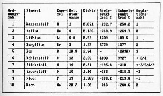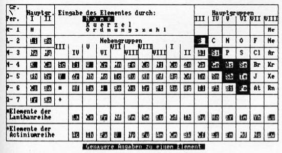 Endlich gibt es mit »Chemie« ein Programm, das nicht nur das komplette Periodensystem der Elemente grafisch übersichtlich darstellt, sondern auf Wunsch auch nähere Informationen zu jedem einzelnen Element preisgibt. Jeder, der sich mit chemischen Stoffen beschäftigt, sei es in der Schule, im Beruf oder als Hobby, weiß, wie oft man auf Bücher zurückgreifen muß, um genauere Angaben über die Elemente zu erhalten. Damit macht nun »Chemie« Schluß, denn es informiert per Tastendruck über das Periodensystem und einzelne chemische Bausteine. Deshalb ist es sowohl zum Üben und Lernen wie auch als Informationsprogramm zu benutzen. Nach dem Start erscheint das Periodensystem auf dem Bildschirm. Dabei sind Metalle hell und Halbmetalle etwas dunkler hinterlegt dargestellt. Alle Atommassen sind auf die Atommasse des Isotops C12 mit dem Wert 12,00000 bezogen. Wenn die Atommasse in Klammern steht, ist es die Massenzahl des langlebigen Isotops. Hinter den Isotopen steht jeweils ihre Halbwertszeit. Während das Periodensystem auf dem Bildschirm dargestellt ist, lassen sich durch Druck auf die Leertaste am unteren Bildschirmrand einzelne Menüpunkte aufrufen. Durch < ENTER > wählen Sie eins der Unterprogramme. Haben Sie sich verwählt, kommen Sie mit der Taste < Z > wieder an den Menü-Anfang. Anzeige des Standortes eines Elements im PSE Nach Wahl dieser Routine erscheint im oberen freien Bildschirmteil ein Untermenü, mit dem Sie die Eingabe des anzuzeigenden Elements bestimmen. Sie wählen wieder mit der Leertaste und < ENTER > und das gesuchte Element ist auf dem Monitor durch Blinken kenntlich gemacht. Durch erneuten Druck der Leertaste gelangen Sie wieder zurück. Genauere Angaben zu einem Element Bei diesem Menüpunkt kommen Sie zunächst in das gleiche Untermenü wie zuvor. Nun erhalten Sie jedoch genauere Informationen über das gewählte Element. Alphabetische Anzeige aller Elemente Die Anzeige der Elemente erfolgt tabellarisch in alphabetischer Reihenfolge. Jeweils zehn Elemente füllen mit näheren Angaben eine Bildschirmseite. Die folgende Seite rufen Sie mit der Leertaste auf. Drücken Sie in diesem Untermenü < ENTER >, erscheint das Periodensystem. Anzeige aller Elemente nach Ordnungszahlen Die Ausgabe erfolgt in Reihenfolge der Ordnungszahlen. Drucker Den Menüpunkt »Drucker« dürfen Sie nur anwählen, wenn ein Drucker angeschlossen ist.