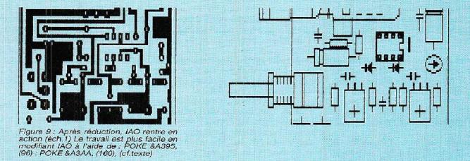 Quelques données sont toutefois à respecter,: Choisir un calque de faible grammage (60). Ne pas le laisser plusieurs jours avant de l'utiliser comme film : le calque bouge considérablement avec l'humidité de l'air, et les documents doivent coincider parfaitement. Augmenter le temps d'insolation aux UVs (faire un petit morceau d'essai). A titre indicatif, pour 4.30 minutes avec un vrai film, 7.30 avec les deux calques. Il est tout à fait possible de faire du double face avec CIAO. La façon la plus rapide, et la plus fiable, consiste à inverser l'image de l'une des faces (avec plus), et à effacer au fur et à mesure l'ancien tracé (avec 2 +- R), en le remplaçant par le nouveau. Cela peut sembler lourd, mais vous verrez très tôt qu'il n'en est rien. Il était impossible de travailler en trois couleurs sur CPC en mode 2. Dans ce cas, le document de contrôle est à imprimer (pour une face au moins), sur calque. Attention toutefois de bien surveiller la feuille de calque à la sortie de l'imprimante : il faut veiller à ce qu'elle ne galbe pas (par la chaleur de la machine), et ne fasse pas une boucle qui bloquerait la tête. Ayez dans la main un corps de stylo pour éventuellement plaquer la feuille, et surveillez jusqu'à l'éjection de la feuille. Pour réencrer vos rubans d'imprimante, une solution efficace consiste à opérer en cours de fonctionnement, afin de bien répartir l'apport extérieur d'encre. Celle-ci est du genre encre à tampon sans huile (PELIKAN 35A197), dont quelques gouttes sont posées à la pointe d'un DEMAK'UP plié en deux, et posé doucement sur le ruban, à la sortie du bloc de gauche. Il suffit de faire attention à ne pas bloquer la tête (qui se décalerait légèrement, en même temps que l'impression), et pour une vingtaine de francs, vous avez de quoi réencrer au moins une centaine de rubans. Le moment où il ne faut plus insister est facilement visible : le ruban n'est plus plan et il forme une boucle importante au tirage. La trame est fichue, il faut la jeter. La solution consistant à ouvrir le bottier de droite, et à réencrer le disque en feutre est une erreur : c'est le disque qui est écrasé, et au bout de quelques tours, la situation revient à son point de départ. Sauf vous, qui passez une heure à essayer de faire partir l'encre de vos doigts... Et IAO ? Eh oui, ce brave IAO éch.1, que devient-il ? Il suffit de partir du document de contrôle, et de reporter les composants en les ayant placés au préalable sur le dessin du CI. Pour faciliter la tâche de report au ½ écran, il convient d'ajouter à IAO en ligne 60, avant DEFINT a-z ceci ! POKE &A395,(96) : POKE &A3AA, (160) : Ainsi, la « vitesse » des flèches + CTRL est augmentée, de sorte que deux coups à droite placent au ½ écran. A vous de trouver pourquoi il n'est pas possible de le faire d'un seul coup !