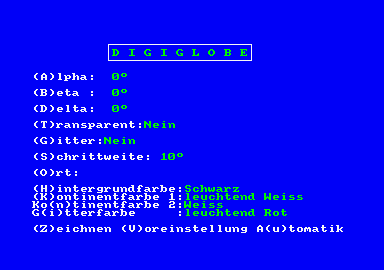 Leserwettbewerb Mit DIGIGLOBE stellen Sie einen Globus auf dem CPC dar, der Ihnen gewünschte Orte anzeigt. Das Programm selbst ist sehr interessant - und bietet die Möglichkeit, mehr daraus zu machen: Wir rufen auf zum Leserwettbewerb! Es gibt Programme, die sind gut und brauchen nicht mehr verändert zu werden. Es gibt aber auch Programme, die ebenfalls gut sind, jedoch - vielleicht auch absichtlich - viele Verbesserungsmöglichkeiten bieten. Der besondere Reiz einer solchen Aufgabe liegt darin, daß man unter Umständen schon bald eine Idee hat - sich aber zunächst in die Programmier-Technik des Programms “einfuchsen” muß. Doch zunächst zur “Urversion” des Programms. DIGIGLOBE zeichnet unseren Planeten in jeder beliebigen Lage auf den Bildschirm Ihres CPC und bietet die Zeichnung von Meridianen sowie Breitenkreisen mit frei wählbarer Grad-Einteilung. Darüber hinaus kann der Globus auch transparent dargestellt werden. Nach dem Start verfangt das Programm die Eingabe verschiedener Daten. Die jeweiligen Optionen können durch Eingabe ihres Anfangsbuchstabens angewählt werden. Zunächst sollte man sich mit den Funktionen der Winkel Alpha, Beta und Delta vertraut machen und verschiedene Einstellungen vornehmen. Die Winkel beschreiben die gewünschte Drehung des Planeten. Die jeweilige Eingabe muß in Dezimalzahlen erfolgen. In der Normalstellung blicken Sie direkt auf den Schnittpunkt von Äquator und Greenwich-Meridian. Alpha dreht den Planeten zunächst um seine eigene Achse, Delta “kippt” den Globus dann nach vorne (positive Werte) beziehungsweise nach hinten (negative Werte). Beta dreht ihn schließlich noch um die Achse, die jetzt (nach der Operation von Delta) auf dem Bildschirm senkrecht steht. Am besten probieren Sie einfach einige Werte aus, um diese geografischen Funktionen kennenzulernen. DIGIGLOBE stellt den Globus aus verschiedenen Ansichtswinkeln dar Die Option Transparent (Auswahl: j/n) erstellt den Globus mit oder ohne durchscheinende Rückseite. Güter stellt den Abstand des Gitternetzes ein, wobei mit dem Wert 0 kein Gitter gezeichnet wird. Ein weiterer Eingabewert ist die Schrittweite (determiniert die Darstellungsgröße des Globus). Sie sollte jedoch nicht zu groß gewählt werden, da sonst die Kugel eckig wird. Zu klein sollte der Wert aber auch nicht sein, da der Bildschirmaulbau sonst zu lang dauert - 10 ist ein guter Wert für den Anfang. Wenn Sie einen bestimmten Ort suchen, geben Sie diesen nach Anwahl von Ort ein. Ebenso können Sie aber auch einen “kleinen Bummel” machen, indem Sie nach Anwahl von Ort Z eingeben - in alphabetischer Reihenfolge können Sie nun mit den Cursor-Tasten die bereits gespeicherten Orte “durchblättern ”. Der angewählte Ort wird mittig auf dem Globus angezeigt, weil die Werte für Alpha und Beta automatisch passend eingestellt werden. Sofern Sie einen neuen Ort - also auch Ihren Wohnort - angezeigt haben wollen, geben Sie ihn einfach ein. Das Programm erfragt dann die exakten Längen- und Breitengrade, die Sie beispielsweise einem großen Atlas entnehmen können. Auch Ihren Wohnort können Sie sich anzeigen lassen Dabei ist auf eine sehr genaue Eingabe zu achten - also eventuell führende Nullen, Leerschritte sowie die Himmelsrichtungen als Buchstaben angeben. Die Stadt Berlin hat zum Beispiel folgende Werte: 13°19'59" O Sind alle Eingaben korrekt erfolgt, wird der Ort abgespeichert und kann künftig jederzeit aufgerufen werden. Die Funktionen der Ort-Option im Überblick: