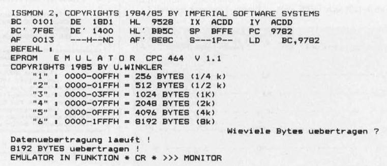 Das Treiberprogramm ist relativ kurz gehalten, um soviel freien RAM -Speicherbereich wie möglich zur Verfügung zu haben. Der Autor verwendete im vorliegenden Fall einen nachladbaren Monitor/Assembler der Firma I.S.S., so daß noch ein freier RAM-Datenpuffer-Bereich von 8 KByte zur Verfügung steht, das heißt, es können in dieser Konfiguration maximal 2764er EPROMs simuliert werden. Verwendet man andere Monitor- beziehungsweise Assembler-Software, so läßt sich dieser Bereich problemlos auf 16 KByte ausdehnen. Die dafür nötigen Änderungen im Treiber sind dem Listing zu entnehmen. Die eigentliche Datentransfer-Routine entspricht den Angaben des Herstellers von PEPS. Adressenwahl Voraussetzung zur Anwendung des PEPS ist, wie bereits angesprochen, ein freier RAM-Bereich in den die Daten entweder per Hand mit einem Monitor oder durch einen Assemblier-vorgang eingeschrieben werden. Das PEPS-Treiber-programm meldet sich mit einem kleinen Menü (hier gestartet aus ISSMON 2). >> Die Startadresse des RAM-Puffers ist mit DATSTA bezeichnet. Ändert man DATSTA im Definitionsteil des Listings, so läßt sich die Lage des Puffers den Bedürfnissen leicht anpassen. In diesem Fall wurde der Bereich 5000h-6FFFh gewählt, um die Funktion des verwendeten Monitors/Assemblers nicht zu beeinträchtigen. Außerdem müssen bei Verwendung eines symbolischen Assemblers eventuell die absoluten Sprünge im assemblierten Objektcode den Erfordernissen der Ziel-Hardware angepaßt werden. Im Klartext: soviel wie möglich relative statt absolute Sprünge verwenden, sowie alle unvermeidlichen absoluten Sprungziele korrigieren. Wer eine Floppy-Station besitzt und über einen leistungsfähigen CP/M-Assembler verfügt, wie den M80, kann mit dem speziellen Befehl ‘.PHASE Adresse' jede beliebige Adreßlage einstellen. Der Speicherbereich des Treiberprogramms und des Datenpuffers (ab 7000h) ist so gewählt. daß man das Programm auch von einem CP/M-Monitor aus (beispielsweise DDT, besser DDTZ) oder auch aus BASIC heraus starten kann.