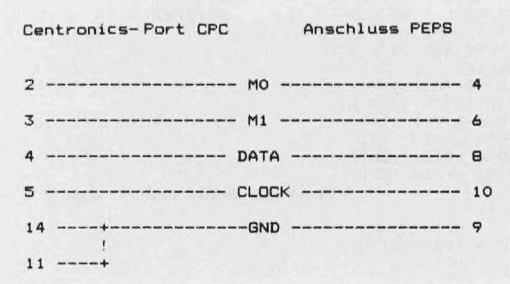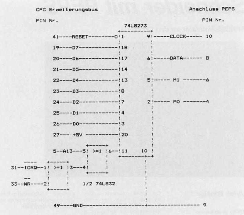 EPROM-Simulator an den CPCs Völlig problemlos läßt sich der EPROM-Simulator PEPS aus c't 5/85 auch an die CPCs anschließen. Am Drucker-Port kommt man ohne jegliche Zusatz-Hardware aus, zwei TTL-Chips sind für den Erweiterungs-Port erforderlich. Das Treiber-Programm ist lediglich an die 16-Bit-Portadressen und die Ein-/Ausgabe anzupassen. Dann kann man via PEPS auch den Schneider als Entwicklungssystem für andere Rechner, Spooler, intelligente Floppy-Karten und so weiter einsetzen.