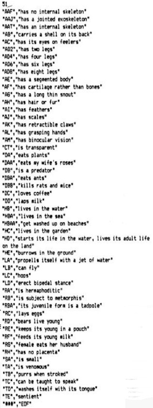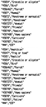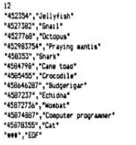 Why represent an idea in a code like this rather than as a conventional "word"? Basically the advantage is the same as that produced by the original classification of living things, in that we can talk to the computer about whole classes of creatures, knowing that it can apply this information to all members of the class, and we can talk to it about a specific creature, knowing that the computer will be "aware" that this specific idea is part of a larger more general one. It will "know" for instance that a cat is a mammal - and can apply information generally true of mammals to "cat" (say, the possession of hair rather than scales or feathers, and feeding milk to young ones). This greatly reduces the amount of data it must store (and plough through) to retrieve information about any given animal. This applies in fact to any idea, as we shall see when we start to generalise our expert system a bit. Another advantage of the code is that the idea is universalised, that it is taken away from the domain of a particular word. Because to the computer "cat" is the character string "4587832", and any real "thought" about the idea "cat" is going to be in terms of that string, it can easily be taught to consider "puss" or "mog" as being the same thing - just as our command routine could easily be persuaded to accept several different words as representing the same command. Even more excitingly, it means that our coding, and the bulk of our basic data, can be used unchanged for a version of our expert system designed to work in Arabic or French or Chinese. All that needs to be changed is »hc file holding the data that permits translation between the "natural language" and the code numbers. One drawback is that we need to go to all the bother of compiling a classified list of all concepts - in the case of plants and animals this has already been done for us because that is the way biologists make sense of the multitude of different organisms on the planet, but in the case of other fields of knowledge it Is not so simple (we can still do it, but it is a hassle). Another drawback of our taxionomic "tree" is that it does not give anything like a complete description of the idea of "cat". The cat is a predator, for instance, but so are many animals, including the praying mantis and the crocodile as well as the lion, tiger, leopard and other animals related more closely to old puss. What we need is another set of ideas - let us call them "attributes" that we can apply to "cat" as well as, say "crocodile". These attributes can be coded and stored in the same way as the codes for the animals themselves - in fact we will store them in an independent file rather than putting them in another field in the file for the animals. Some attributes, with their codes that we might want to assign to "cat" might be: CW White (at least my old moggy is) Don't worry too much about the derivations of the codes for the moment - the important thing is that all three attributes need to be linked to "cat". One way to do this would be the method we used in "Structured Data", using "field" entries for (say) "Relationship to man", "Habitat" and "Colour" and keep everything in one file, (or one data array in RAM memory). The trouble is that we may want to make many entries for some headings - for instance, cats can be many colours besides white and feral cats don't live in people's homes. A more flexible way of doing essentially the same thing is to have three data files (or arrays) - one for the animals, one for their attributes and a third that 'links" the other two. Assuming the other two files will be exactly as above, our "linker" file will include these entries for "cat"- (Animal code) (Characteristic code) In addition, wc will want to includc attributes of the wider divisions to which "cat" belongs - say the following: Cat family (458783) : has retractable claws (AK) These things will be true of "cat", of course, and at the same time true of other creatures on different limbs of our "tree". Let's get down to programming and sec if we can get this working! We will cheat a bit and look at our "report" or enquiry module first - this sort of thing is called "bottom-up implementation" and is actually quite respectable from an academic point of view nowadays. The first thing is to get our data files set up - since we have not yet got our input routines working we will do this by setting up ASCII files with the word processor; TASWORD, PROTECT, or WORDSTAR will all do the job nicely. If you haven't got a word processor, then even "ED", the good ole CP/M text editor, is quite adequate for this purpose. If all else fails, you can always cheat by getting this month's cassette and using "CASLOAD" from the CP/M 2.2 disc to load the data files up to disc. Assuming you are using your word processor (remembering to use its ASCII facility so that you haven't got a lot of unwanted control characters), then simply open files (named aft follows) and type in the following data as text. The result is exactly what a BASIC program like Structured Data produces of course. (If you don't believe me then have a look at an SD file)! 1) The following into a file called "animals.exp".