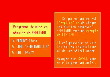 Cet utilitaire exceptionnel, offre à tous ceux qui désirent allier texte et graphisme en MODE 1, diverses possibilités à base d'extensions RSX.-Ecriture à l'écran de 1484 caractères au lieu de 1000. -Redéfinition des caractères propres à cette nouvelle convention. — Ecriture à la position du curseur graphique au lieu du curseur texte. — Création de fenêtres animées permettant l'affichage continuel d'un texte à l'intérieur d'un espace restreint. — Identification d'une fenêtre à une variable alphanumérique. L'état de chaque fenêtre ainsi sauvegardée, rend possible l'animation simultanée de plusieurs d'entre-elles. Le programme basic de démonstration (spectaculaire !), présente et explique de façon détaillée l'utilisation des instructions suivantes : |SYMBOL,n,v,v,v,v,v,v,v : redéfinition des caractères (n = code ASCII, v = valeur de chaque octet). |PRINT, @a$ : écriture du contenu de a$, à la position du curseur graphique. |PRINT2, @a$ : écriture en double hauteur du contenu de a$. |PEN, v : précise la couleur v (0 à 3) du stylo. |PAPER, v : fixe la couleur v (0 à 3) du papier. |WINDOW,s,p,l,h : déclare une fenêtre de paramètres (s)tylo, (p)apier, (l)argeur, et(h)auteur. |WINDOW2,s,p,l,h : déclare une fenêtre entourée d'un cadre de la couleur graphique. |WPRINT, @a$, @b$,...: déclare les chaînes (maximum 67) à afficher dans les fenêtres. |TURN: défilement de la fenêtre courante. |SENS,v : indique le sens v (0 vers la gauche et 1 vers le haut) de défilement. |RAZ : remise à zéro du défilement. |CLS : efface la fenêtre courante, ou plutôt la remplit de la couleur du papier. |WPEN, v : fixe la couleur v (0 à 3) de stylo du texte défilant. |WPAPER,v : indique la couleur v(0à3) du papier du texte défilant. |WSAVE, @ fen$: sauvegarde l'état d'une fenêtre dans une chaîne alphanumérique (voir |WLEN,a%). |WLOAD, @ fen$: ouvre une fenêtre préalablement attribuée à une chaîne alphanumérique. |WLEN, @ a% : précise le nombre a% (valeur entière) de caractères contenus dans une chaîne alphanumérique assimilée à une fenêtre. |TURN. @ fen$ : simplification, de |WLOAD, @fen$ TURN et |WSAVE, @ fen$. Entrez les codes hexadéci-maux du premier listing à l'aide du programme Amsaisie (reportez-vous à son mode d'emploi). Spécifiez 9AB5 comme adresse de début et sauvez la totalité du langage machine par l'option 'S'sous le nom Fenetrad (à la suite du programme de démonstration dans le cas d'une sauvegarde K7). Si vous désirez morceler votre saisie, créez plusieurs fichiers (FEN1, FEN2, FEN3, etc.), puis chargez-les ultérieurement à la suite après un MEMORY &9AB4 et effectuez une sauvegarde totale et définitive par la fonction : SAVE'"FENETRAD. BIN",b, &9AB5, &B4B.