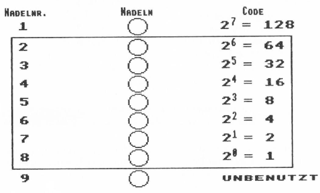 Wie man Hardcopies auf dem CPC selber programmiert Sieht man sich die Leserbriefecke der “PC Amstrad International“ einmal näher an, so stellt man fest, daß kaum ein Thema die Gemüter so erhitzt wie die Druckeranpassung für diverse Hardcopyprogramme. Dieser Beitrag soll Ihnen zeigen, was Hardcopyprogramme sind, wie sie funktionieren und wie man diese selbst programmieren kann. Hier kommen sowohl BASIC-als auch Maschinenspracheprogrammierer auf ihre Kosten: Zuerst werden wir ein Hardcopyprogramm in BASIC und dann eines in Maschinensprache schreiben. Zunächst sollte geklärt werden, was Hardcopyprogramme sind. Es sind Programme, die den Bildschirminhalt möglichst maßstabsgetreu auf dem Drucker ausdrucken. Das “möglichst“ sollte betont werden, da wohl die wenigsten Leute einen Plotter oder Farbdrucker ihr eigen nennen. Wir wollen uns deshalb auf neunnadlige EPSON-und kompatible Matrixdrucker beschränken, da EPSON quasi Standard in der Druckerbranche ist, und neunnadiige Drucker immer noch den Großteil der im Homecomputerbereich benutzten Drucker ausmachen. Trotzdem sind Anpassungen an andere Druckertypen leicht möglich, da alles genau beschrieben wird. Der Druckkopf Bevor wir allerdings so richtig loslegen, sollten wir uns mit der Hardware des Druckers beschäftigen. Schauen Sie sich bitte einmal Abbildung 1 an. Sie zeigt schematisch die Darstellung eines neunnadligen Druckkopfes. Es fallt sofort auf, daß die neunte Nadel nicht benutzt wird. Sie wird nur bei der sogenannten 9-Nadel-Grafik angesprochen, die wir hier aber außer acht lassen. Die Abbildung zeigt, daß sich jede Nadel durch eine Zweierpotenz ansprechen läßt. Wenn Sie zum Beispiel die Nadeln 2, 5 und 7 aktivieren wollen, müssen Sie einfach die Werte 26, 21 und 21 addieren und diesen Wert dann dem Drucker mit PRINT # 8,CHR$(74)Übermitteln.Das leidige achte Bit Das ist allerdings gar nicht so einfach, weil uns die Hardware des CPCs einen Strich durch die Rechnung macht. Die Druckerschnittstelle des CPCs spricht nämlich bei der Übermittlung von Daten das achte Bit nicht an. Das heißt, daß wir nur Zeichen von 0 bis 127 übermitteln können und daß uns deshalb nur maximal 7 Nadeln zur Verfügung stehen. Leider kann ich Ihnen nicht sagen, warum die Firma AMSTRAD auf dieses wichtige achte Bit verzichtet hat. Aber auch dieses Manko läßt sich überwinden, wie Sie später sehen werden. Der Einfachheit halber werden wir das Hardcopyprogramm für den MODE 2 schreiben, da sich Farben, wie sie in MODE 1 und MODE 0 existieren, auf einem “normalen“ Matrixdrucker nur durch verschiedene Muster andeuten lassen, und das würde die Sache unnötig komplizierter machen. MODE 2 hat, wie Sie wissen, horizontal 640 und vertikal 200 Bildpunkte (intern rechnet der Computer aber mit 400 vertikalen Bildpunkten, bei der Darstellung wird aber jeder zweite übersprungen). Wir benötigen also ein Programm, das, von links oben beginnend, immer sieben untereinanderliegende Punkte in eine Bytezahl umwandelt (wie vorher beschrieben), zum Drucker sendet und nach rechts das ganze 640mal wiederholt. Dann sollte das Programm mit der nächsten Zeile beginnen.