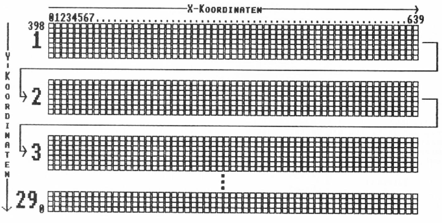 'Was tun?' fragte der Programmierer Die Lösung dieses Problems besteht darin, den Wert der horizontalen Auflösung (bisher 640) so zu erhöhen, daß sowohl Low- als auch Highbyte unter dem Limit von 128 liegen. Nach längerem Probieren kommt man auf die nächsthöhere Zahl, bei der das der Fall ist, nämlich 768. Bei ihr ist das Lowbyte 0 und das Highbyte 3. Unsere Umschaltung auf den Grafikdruck lautet folglich: PRIINT #8 , CHR$(27)+ "L" + CHR$(0)+CHR$[3)Sie werden sich jetzt natürlich fragen, was wir mit den 128 (768 weniger 640 gibt 128) überflüssigen Grafikzeichen machen, denn die vom Hardcopyprogramm abgeschickten Daten müssen der Zahl 768 genau entsprechen, weil es sonst zu merkwürdigen Ergebnissen kommen könnte. Aber auch hierfür gibt es eine Lösung: Wir senden dem Drucker zuerst 128 Nullbytes und dann die 640 Grafikzeichen. So rückt die Hardcopy etwas in die Mitte des Papiers, und es kommt zu keinen unliebsamen Ergebnissen.Das BASIC-Programm Listing 1 ist ein solches Hardcopyprogramm - und zwar in BASIC geschrieben: Das “WIDTH 255“ in Zeile 30 dient dazu, den automatischen Wagenrücklauf und Zeilenvorschub auszuschalten. BASIC hat nämlich die Eigenschaft, standardmäßig nach je 132 Zeichen den Drucker zu veranlassen, einen Zeilenvorschub (ASCII-Code: 10) und einen Wagenrücklauf (ASCII-Code: 13) zu machen. Da wir dies aber nur nach je 768 Zeichen haben wollen, hätte das unliebsame Auswirkungen. Mit dem “ORIGIN 0,0“ wird das Grafiksystem des CPC zurückgesetzt. Zeile 40 schaltet mit einem Steuercode den Zeilenvorschub auf 7/72 Zoll. Damit wird sichergestellt, daß keine Abstände zwischen den Druckzeilen entstehen. Die Variable y wird in Zeile 50 mit der ersten Bildschirmzeile geladen. In Zeile 60 tritt der CPC in eine FOR-NEXT-Schleife ein, die ihn veranlaßt, die Zeilen 70 bis 150 29mal zu wiederholen. Zeile 70 bringt den Druckkopf in die nächste Zeile, und Zeile 80 stellt den Drucker auf Grafikdruck mit 768 horizontalen Punkten ein. Jetzt müssen dem Drucker 768 Daten für eine Zeile übergeben werden: Zeile 90 schickt an den Drucker zunächst 128 Nullbytes, damit dieses Soll erfüllt wird. Jetzt werden mit der Schleife in Zeile 100 alle horizontalen Punkte auf dem Bildschirm abgefragt. Das erledigt die BASIC-Funktion TEST in Zeile 110. Diese Funktion bewegt den Grafikcursor an den angegebenen Koordinatenpunkt und gibt die Nummer des Farbstifts an, der an dieser Position verwendet wurde. ,In MODE 2 sind nur zwei Werte möglich, nämlich 0 und 1. Zeile 110 prüft nun die sieben untereinanderliegenden Punkte, indem sie die Nummer des Farbstifts mit der jeweiligen Zweierpotenz multipliziert und die Werte dann addiert. Dieser Vorgang wird Ihnen wahrscheinlich verständlicher, wenn Sie sich Abbildung I noch einmal anschauen. Zeile 120 prüft, ob das Programm gerade die letzte Zeile geprüft hat. Ist das der Fall, so werden mit der AND-Funktion nur die Bits 3 bis 6 zugelassen, da die letzte Zeile nur aus vier Grafikzeilen besteht. Abbildung 2 macht Ihnen diesen Vorgang verständlicher. Zeile 130 druckt dann endlich das Grafikzeichen aus. Wichtig ist hier vor allem, wie bei allen anderen PRINT #8-Kommandos, daß am Schluß das Semikolon nicht vergessen wird, da der Druckkopf sonst gleich in die nächste Zeile springen würde. Mit der Zeile 140 wird dann sofort die nächste x-Koordinate bearbeitet. Sobald das Programm mit einer Druckzeile fertig ist, wird die y-Koordinate in Zeile 150 um 7 Pixel vermindert, und der Vorgang beginnt von neuem, bis alle 29 Druckzeilen abgearbeitet sind. Wenn Sie das Programm wie abgedruckt starten, werden Sie feststellen, daß es zwar funktioniert, den Druckvorgang aber in einer äußerst langsamen Geschwindigkeit bewerkstelligt. Für eine Hardcopy braucht dieses Programm auf meinem Drucker durchschnittlich 12 Minuten! Vor allem die TEST-Funktion in Zeile 110 nimmt viel Zeit in Anspruch. Sie wissen wahrscheinlich schon, auf was ich hinaus will: Eine Programmierung des Hardcopyprogramms in Maschinensprache wird unumgänglich, Wenn Ihnen das BASIC-Programm aber klar ist, wird Ihnen dieser Schritt auch nicht mehr schwerfallen.